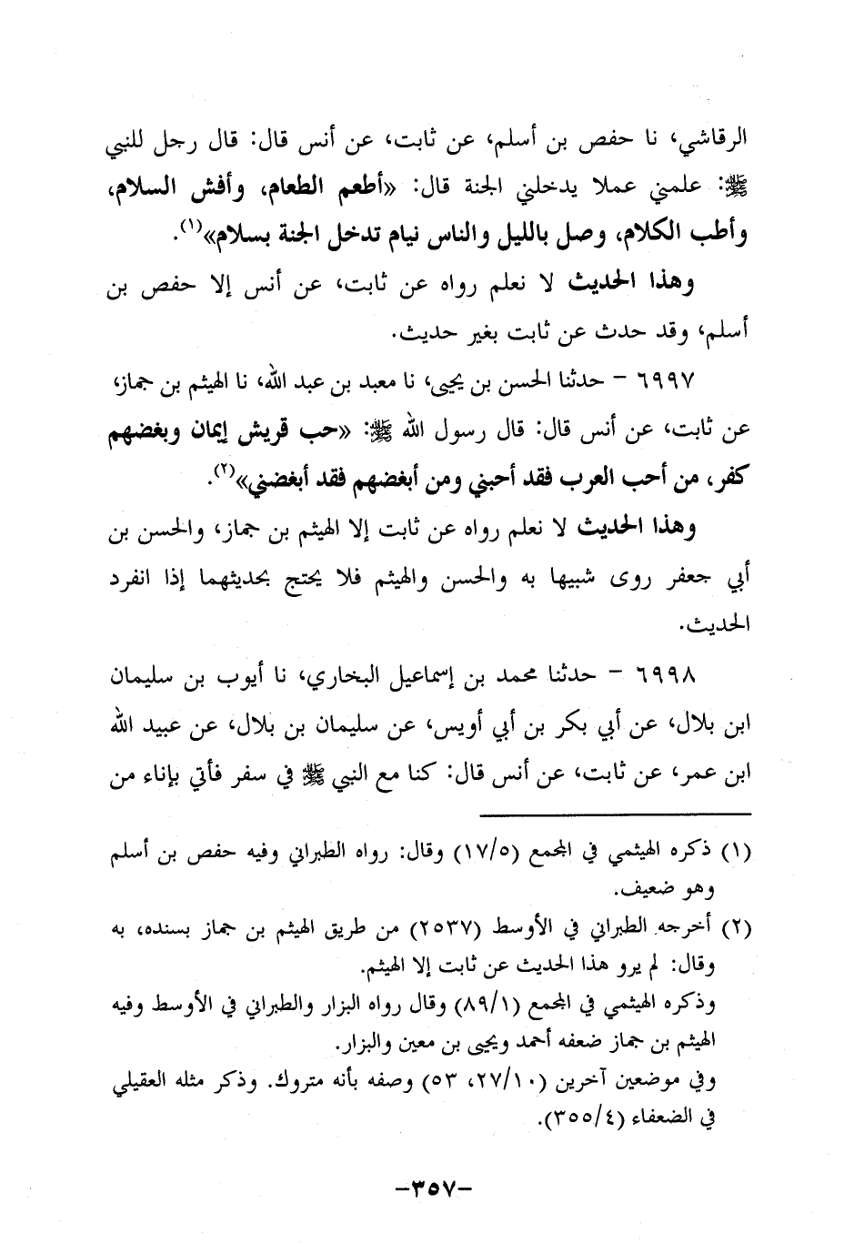 6997- حَدَّثنا الحسن بن يَحيَى، حَدَّثنا معبد بن عبد الله، حَدَّثنا الْهَيْثَمُ بْنُ جَمَّازٍ، عَنْ ثابتٍ، عَن أَنَسٍ، قَالَ: قَالَ رَسُولُ اللَّهِ صَلَّى اللَّهُ عَلَيه وَسَلَّم: حُبُّ قُرَيْشٍ إِيمَانٌ وَبُغْضُهُمْ كُفْرٌ مَنْ أَحَبَّ الْعَرَبَ فَقَدْ أَحَبَّنِي، وَمَنْ أَبْغَضَهُمْ فَقَدْ أَبْغَضَنِي.