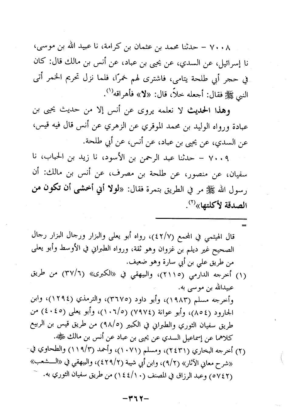 7009- حَدَّثنا عبد الرحمن بن الأسود، حَدَّثنا زيد بن الحباب، حَدَّثنا سُفيان، عَن مَنْصُورٍ , عَنْ طَلْحَةَ بْنِ مُصَرِّفٍ، عَن أَنَس بْنِ مَالِكٍ: أَنَّ رَسُولَ اللهِ صَلَّى اللَّهُ عَلَيه وَسَلَّم مَرَّ فِي الطَّرِيقِ بِتَمْرَةٍ فَقَالَ: لَوْلَا أَنِّي أَخْشَى أَنْ تَكُونَ مِنَ الصَّدَقَةِ لأَكَلْتُهَا.