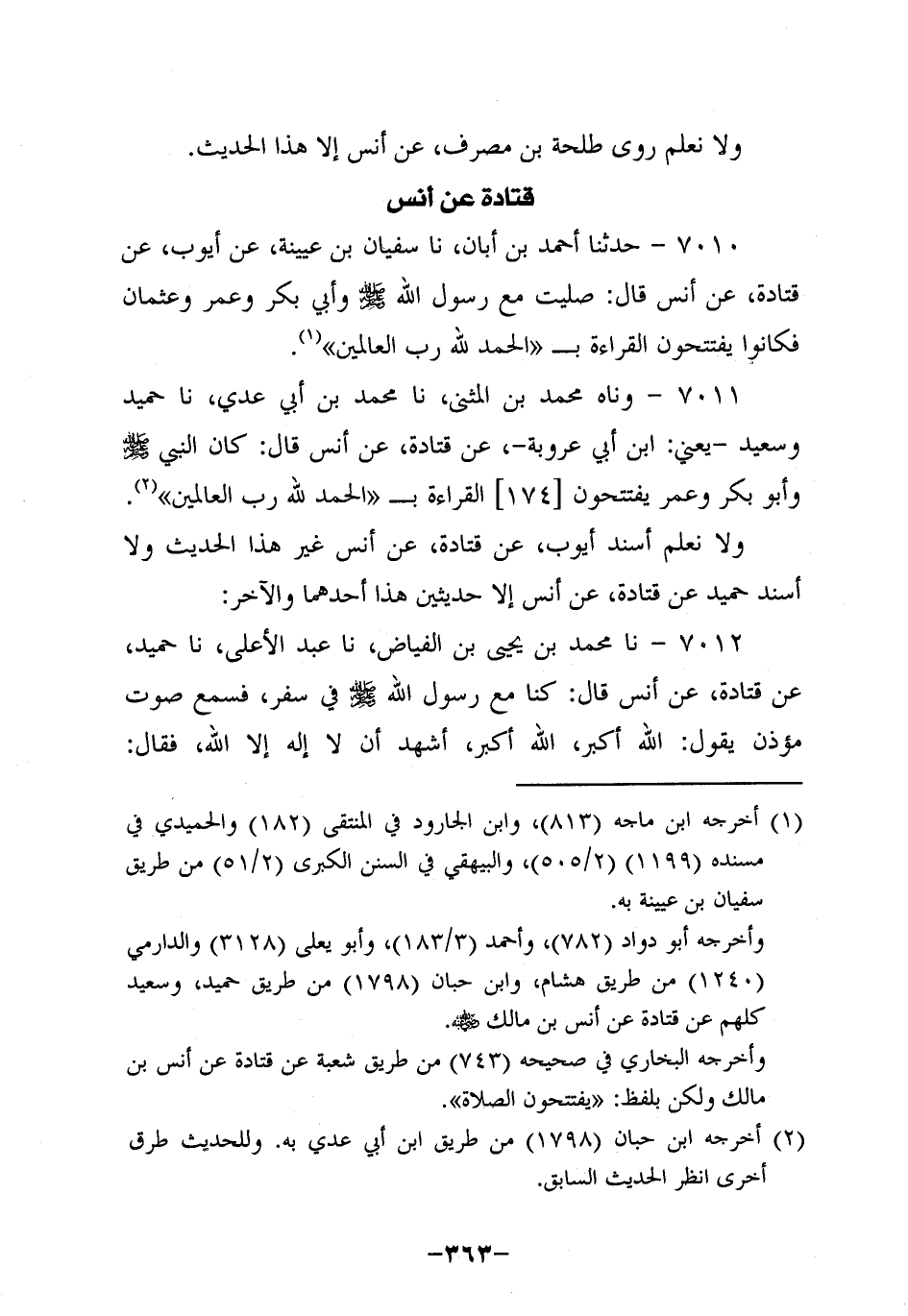 7011- وحَدَّثناه محمد بن المثنى، حَدَّثنا محمد بن أبي عَدِيّ، حَدَّثنا حُمَيد وسعيد - يعني: ابن أبي عروية - عَن قَتادة، عَن أَنَسٍ، قَالَ: كَانَ النَّبِيّ صَلَّى اللَّهُ عَلَيه وَسَلَّم، وَأبُو بَكْرٍ وَعُمَرُ يَفْتَتِحُونَ الْقِرَاءَةَ بـ {الْحَمْدُ لِلَّهِ رَبِّ الْعَالَمِينَ} .