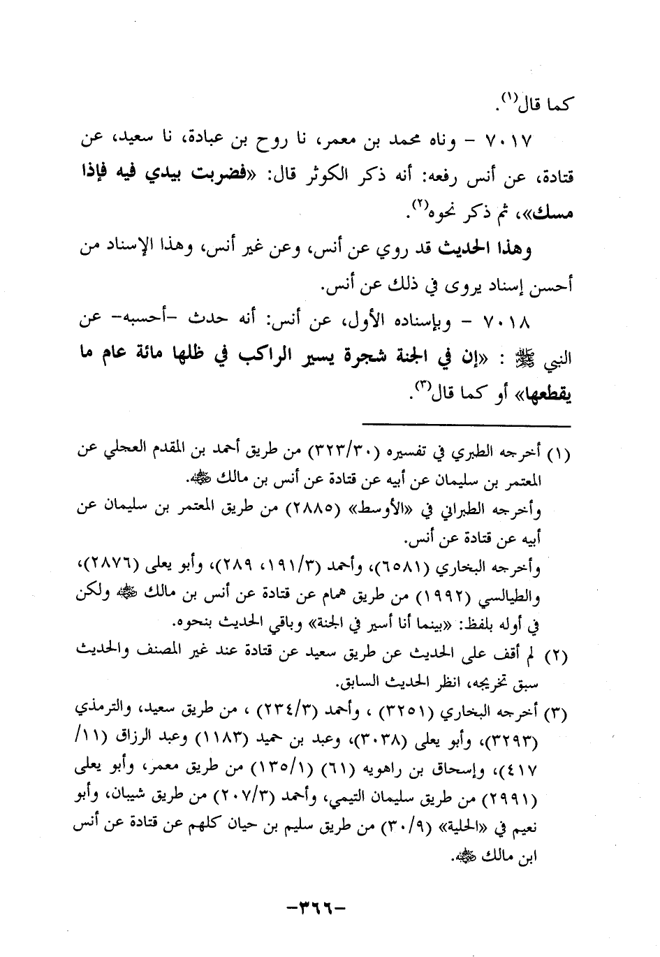 7018- وَبِإِسْنَادِهِ الأَوَّلِ، عَن أَنَس؛ أَنه حَدَّثَ، أَحسَبُهُ - عَن النَّبِيّ صَلَّى اللَّهُ عَلَيه وَسَلَّم: أَنَّ فِي الْجَنَّةِ شَجَرَةٌ يَسِيرُ الرَّاكِبُ فِي ظِلِّهَا مِئَة عام ما يقطعها، أو كما قال.