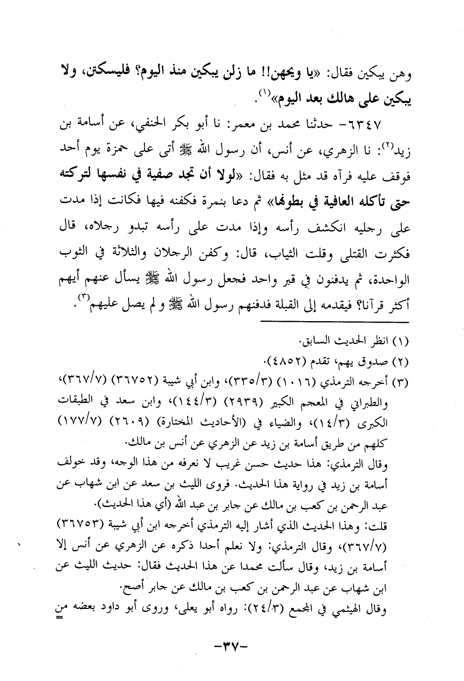 6347- حَدَّثنا محمد بن مَعْمَر، حَدَّثنا أَبُو بَكْرٍ الْحَنَفِيُّ , عَنْ أُسَامة بْنِ زَيْدٍ، حَدَّثنا الزُّهْرِيّ، عَن أَنَس؛ أَنَّ رَسُولَ اللَّهِ صَلَّى اللَّهُ عَلَيْهِ وَسَلَّمَ أَتَى عَلَى حَمْزَةَ يَوْمَ أحد فوقف عليه فرآه قد مُثِّلَ بِهِ فَقَالَ: لَوْلَا أَنْ تَجِدَ صَفِيَّةُ فِي نَفْسِهَا لَتَرَكْتُهُ حَتَّى تَأْكُلَهُ الْعَافِيةُ فِي بُطُونِهَا، ثُمَّ دَعَا بِنَمِرَةٍ فَكَفَّنَهُ فِيهَا فَكَانَتْ إذا مدت علي رجليه انكشفت رَأْسُهُ، وَإِذَا مُدَّتْ عَلَى رَأْسِهِ تَبْدُو رِجْلاهُ قَالَ: فَكَثُرَتِ الْقَتْلَى وَقَلَّتِ الثِّيَابُ قَالَ: وَكُفِّنَ الرَّجُلانِ وَالثَّلاثَةُ فِي الثَّوْبِ الْوَاحِدَةِ، ثُمَّ يُدْفَنُونَ فِي قَبْرٍ وَاحِدٍ فَجَعَلَ رَسُولُ اللَّهِ صَلَّى اللَّهُ عَلَيْهِ وَسَلَّمَ يَسْأَلُ عَنْهُمْ أَيُّهُمْ أَكْثَرُ قُرْآنًا؟ فَيُقَدِّمُهُ إِلَى الْقِبْلَةِ فَدَفَنَهُمْ رَسُولُ اللَّهِ صَلَّى اللَّهُ عَلَيْهِ وَسَلَّمَ وَلَمْ يُصَلِّ عَلَيْهِمْ.