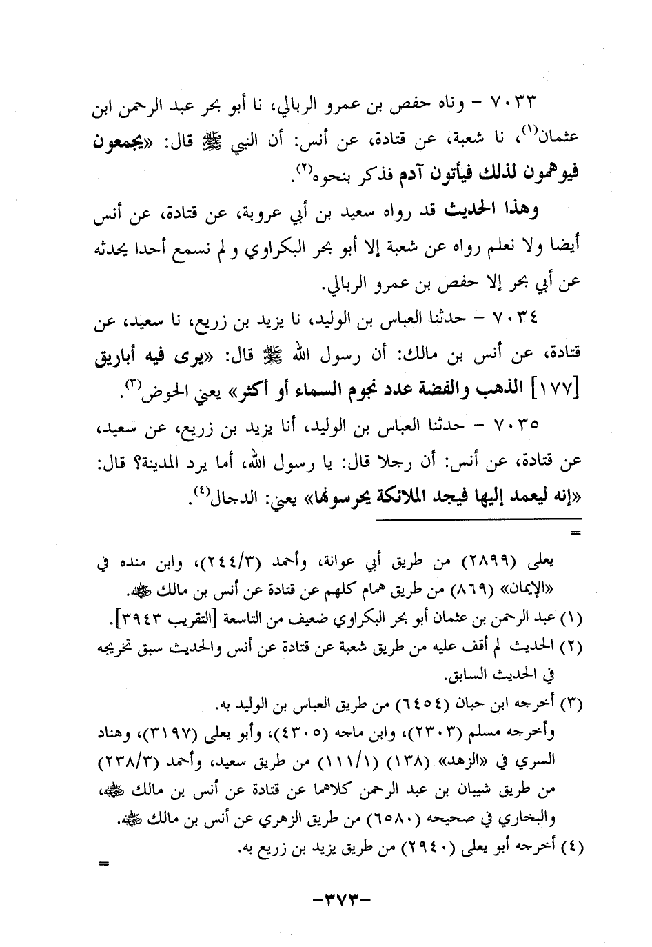 7033- وحَدَّثناه حفص بن عَمْرو الربالي، حَدَّثنا أَبُو بحر عبد الرحمن بن عُثمَان، حَدَّثنا شُعْبَةُ، عَن قَتادة، عَن أَنَس؛ أَن النَّبِيّ صَلَّى اللَّهُ عَلَيه وَسَلَّم قَالَ: يُجْمَعُونَ فَيُوهَمُونَ لِذَلِكَ فَيَأْتُونَ آدَمَ فَذَكَرَ بِنَحْوِهِ.