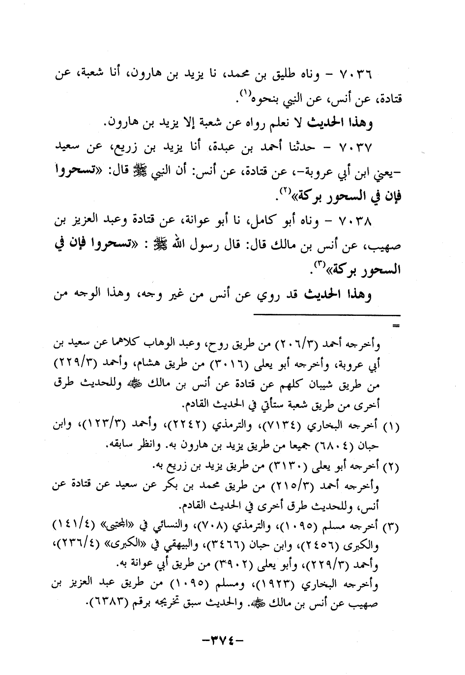 7037- حَدَّثنا أحمد بن عبدة , أخبرنا يَزِيدُ بْنُ زُرَيْعٍ، عَنْ سَعِيدٍ، يَعْنِي ابْنَ عَرُوبة، عَن قَتادة، عَن أَنَس؛ أَن النَّبِيّ صَلَّى اللَّهُ عَلَيه وَسَلَّم قَالَ: تَسَحَّرُوا فَإِنَّ في السحور بركة.