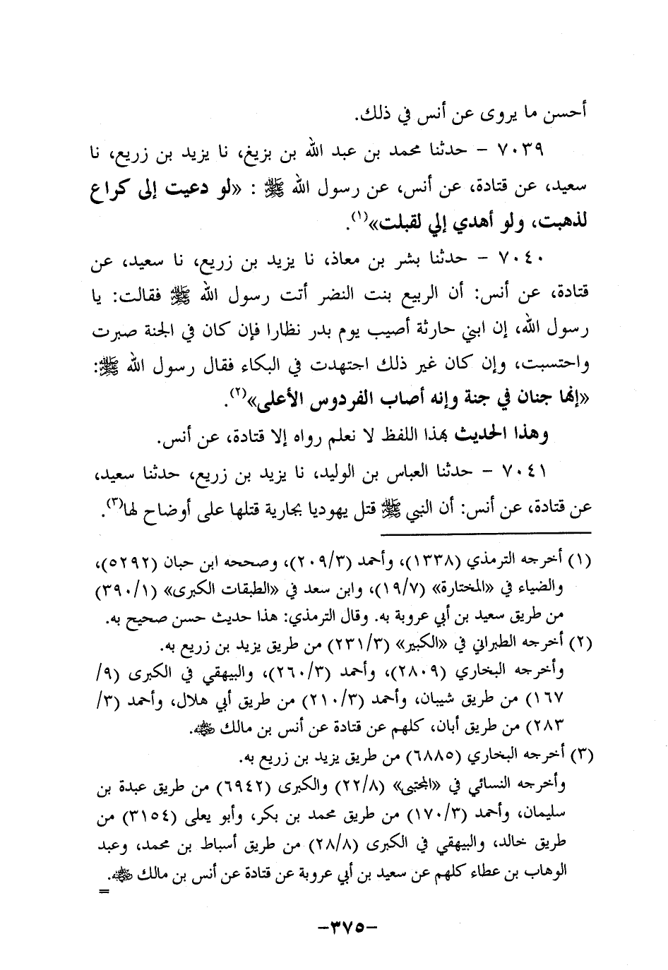 7040- حَدَّثنا بِشْر بن معاذ، حَدَّثنا يَزِيدُ بْنُ زُرَيْعٍ، حَدَّثنا سَعِيدٌ، عَن قَتادة عَنْ أَنَسٍ: أَنَّ الرُّبَيِّعَ بِنْتَ النَّضْرِ أَتَتْ رَسُولِ اللَّهِ صَلَّى اللَّهُ عَلَيه وَسَلَّم فَقَالَتْ: يارسول اللَّهِ إِنَّ ابْنِي حَارِثَةَ أُصِيبَ يَوْمَ بَدْرٍ نَظَّارًا , فَإِنْ كَانَ فِي الْجَنَّةِ صَبَرْتُ وَاحْتَسَبْتُ , وَإِنْ كَانَ غَيْرَ ذَلِكَ اجْتَهَدْتُ فِي الْبُكَاءِ , فَقَالَ رَسُولُ اللَّهِ صَلَّى اللَّهُ عَلَيه وَسَلَّم: إِنَّهَا جِنَانٌ فِي جَنَّةٍ وَإِنَّهُ أَصَابَ الْفِرْدَوْسَ الأَعْلَى.