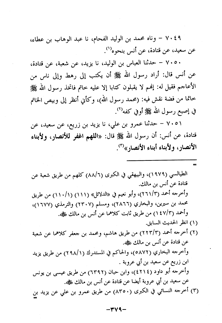 7051- حَدَّثَنا عَمْرُو بْنُ عَلِيٍّ، حَدَّثنا يَزِيدُ بْنُ زُرَيْعٍ، عَنْ سَعِيدٍ، عَن قَتادة، عَن أَنَس: أَنَّ رَسُولَ اللَّهِ صَلَّى اللَّهُ عَلَيه وَسَلَّم قَالَ: اللَّهُمَّ اغْفِرْ لِلأَنْصَارِ , وَلأَبْنَاءِ الأَنْصَارِ , وَلأَبْنَاءِ أَبْنَاءِ الأَنْصَارِ.