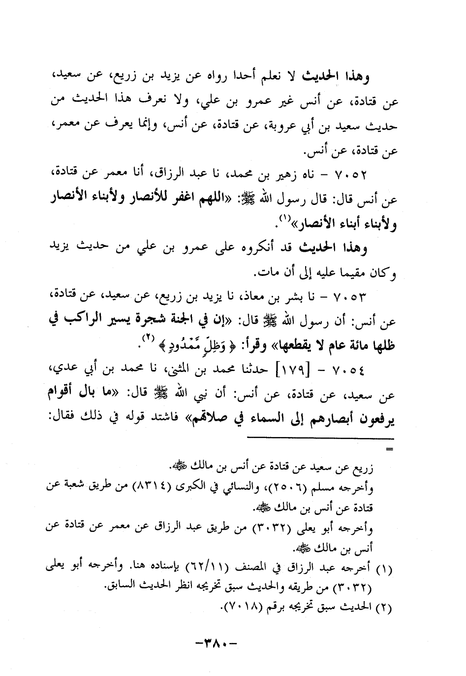 7052- حَدَّثناه زهير بن محمد، حَدَّثنا عبد الرَّزَّاق , أخبرنا مَعْمَر، عَن قَتادة، عَن أَنَسٍ، قَالَ: قَالَ رَسُولُ اللَّهِ صَلَّى اللَّهُ عَلَيه وَسَلَّم: اللَّهُمَّ اغْفِرْ لِلأَنْصَارِ وَلأَبْنَاءِ الأَنْصَارِ وَلأَبْنَاءِ أَبْنَاءِ الأَنْصَارِ.