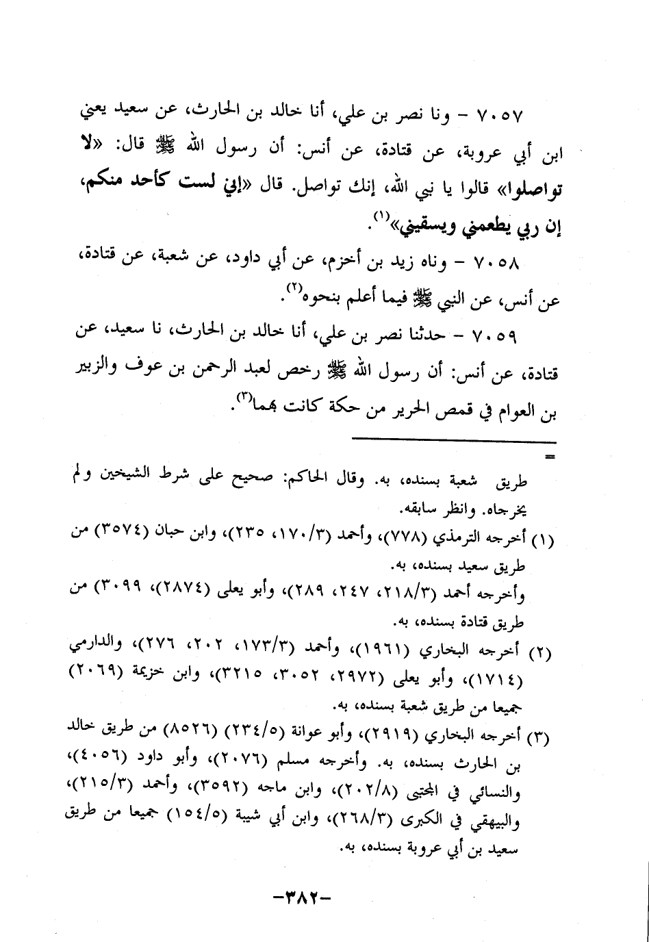 7057- وحَدَّثنا نصر بن علي , أخبرنا خَالِدُ بْنُ الْحَارِثِ، عَنْ سَعِيدٍ، يَعْنِي ابْنَ أَبِي عَرُوبة، عَن قَتادة، عَن أَنَس؛ أَن رَسولَ اللهِ صَلَّى اللَّهُ عَلَيه وَسَلَّم قَالَ: لا تواصلوا , قالوا: يانبي اللَّهِ إِنَّكَ تُوَاصِلُ. قَالَ إِنِّي لَسْتُ كَأَحَدٍ منكم , إن ربي يطعمني ويسقيني.