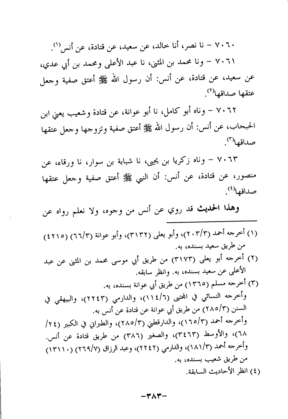 7061- وحَدَّثنا محمد بن المثنى، حَدَّثنا عَبْدُ الأَعْلَى، ومُحَمد بْنُ أَبِي عَدِيّ، عَنْ سَعِيدٍ، عَن قَتادة، عَن أَنَس؛ أَن رَسولَ اللهِ صَلَّى اللَّهُ عَلَيه وَسَلَّم أَعْتَقَ صَفِيَّةَ , وجعل عتقها صداقها.
