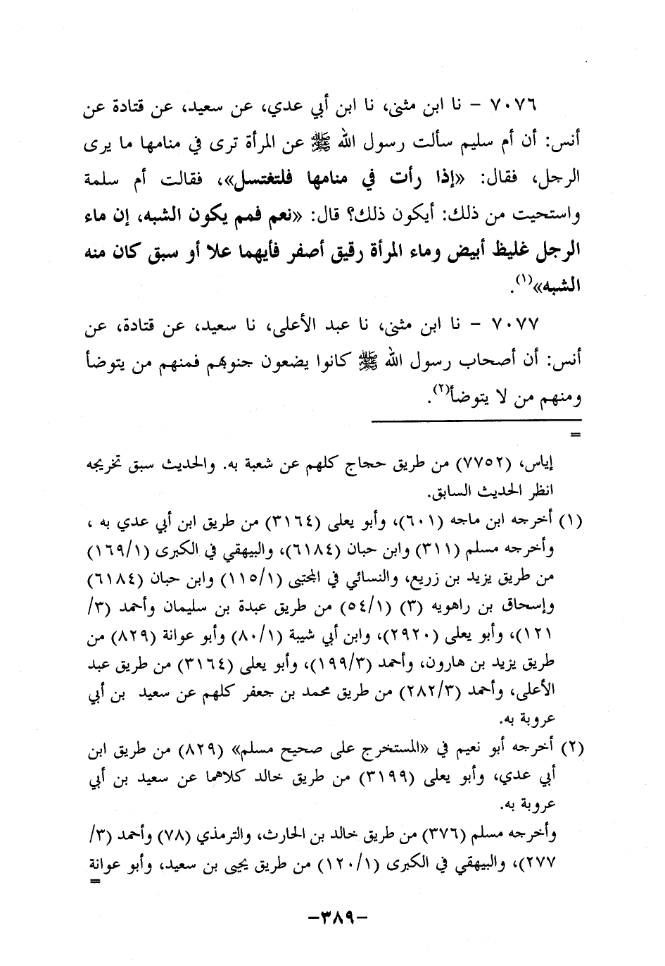 7077- حَدَّثنا ابن مثنى، حَدَّثنا ابن أبي عدي (1) ، حَدَّثنا سَعِيدٌ، عَن قَتادة، عَن أَنَس؛ أَن أَصْحَابُ رَسُولِ اللَّهِ صَلَّى اللَّهُ عَلَيه وَسَلَّم كَانُوا يَضَعُونَ جُنُوبَهُمْ , فَمِنْهُمْ مَنْ يَتَوَضَّأُ , وَمِنْهُمْ من لا يتوضأ.