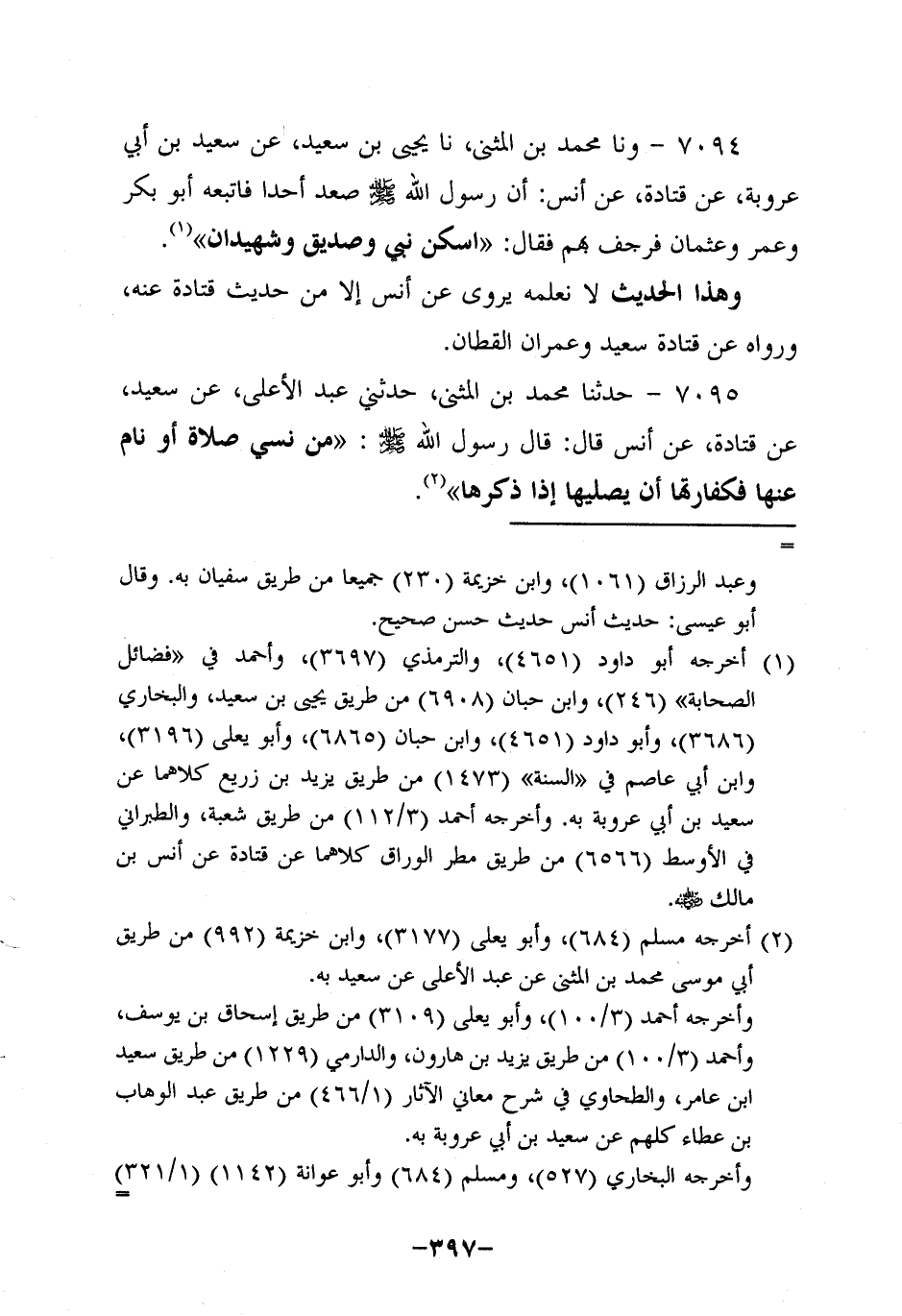 7094- وحَدَّثنا محمد بن المثنى، حَدَّثنا يَحْيَى بْنُ سَعِيدٍ، عَنْ سَعِيدِ بْنِ أَبِي عَرُوبة، عَن قَتادة، عَن أَنَس؛ أَن رَسولَ اللهِ صَلَّى اللَّهُ عَلَيه وَسَلَّم صَعِدَ أُحُدًا، فَاتَّبَعَهُ أَبُو بَكْرٍ وَعُمَرُ وعُثمَان فَرَجَفَ بِهِمْ فَقَالَ: اسْكُنْ؛ نبيٌّ، وصِدِّيقٌ، وَشَهِيدَانِ.