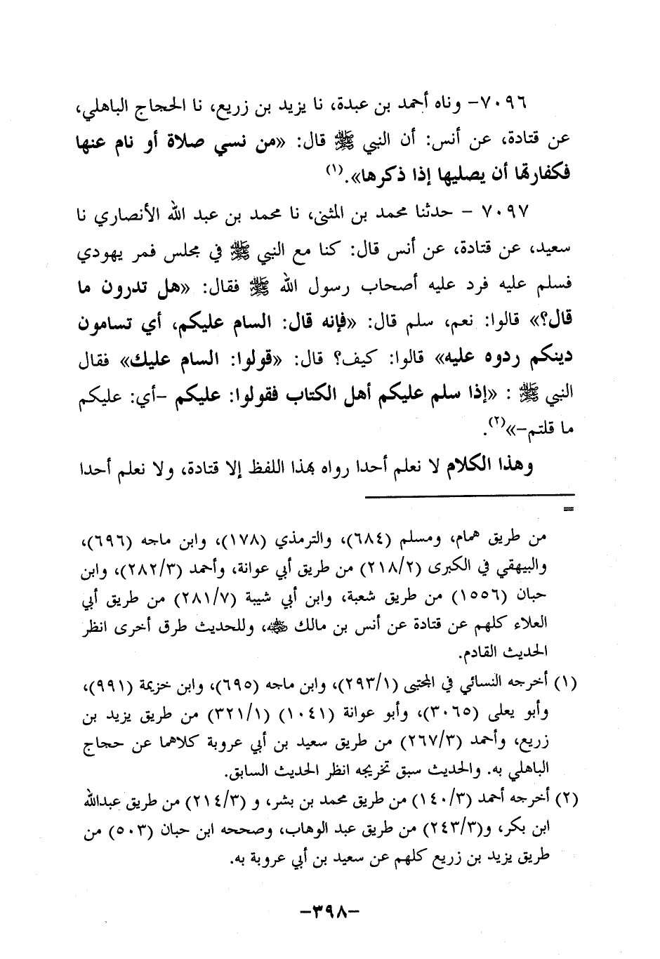 7097- حَدَّثنا محمد بن المثنى، حَدَّثنا محمد بن عبد الله الأنصاري، حَدَّثنا سَعِيدٌ، عَن قَتادة، عَن أَنَسٍ، قَالَ: كُنَّا مَعَ رَسُولِ اللَّهِ صَلَّى اللَّهُ عَلَيه وَسَلَّم فِي مَجْلِسٍ , فَمَرَّ يَهُودِيٌّ , فَسَلَّمَ عَلَيْهِ , فَرَدَّ عَلَيْهِ أَصْحَابُ رَسُولِ اللَّهِ صَلَّى اللَّهُ عَلَيه وَسَلَّم , فَقَالَ: هَلْ تَدْرُونَ مَا قَالَ؟ قَالُوا:نَعَمْ , سَلَّمَ , قَالَ: فَإِنَّهُ قَالَ: السَّامُ عَلَيْكُمْ , أَيْ تسامونَ دِينَكُمْ , رُدُّوهُ عَلَيْهِ , قَالُوا: كَيْفَ؟ قَالَ: قُولُوا: السَّامُ عَلَيْكَ , فَقَالَ النَّبِيّ صَلَّى اللَّهُ عَلَيه وَسَلَّم: إِذَا سَلَّمَ عَلَيْكُمْ أَهْلُ الْكِتَابِ فَقُولُوا: عَلَيْكُمْ - أَيْ: عَلَيْكُمْ مَا قُلْتُمْ.