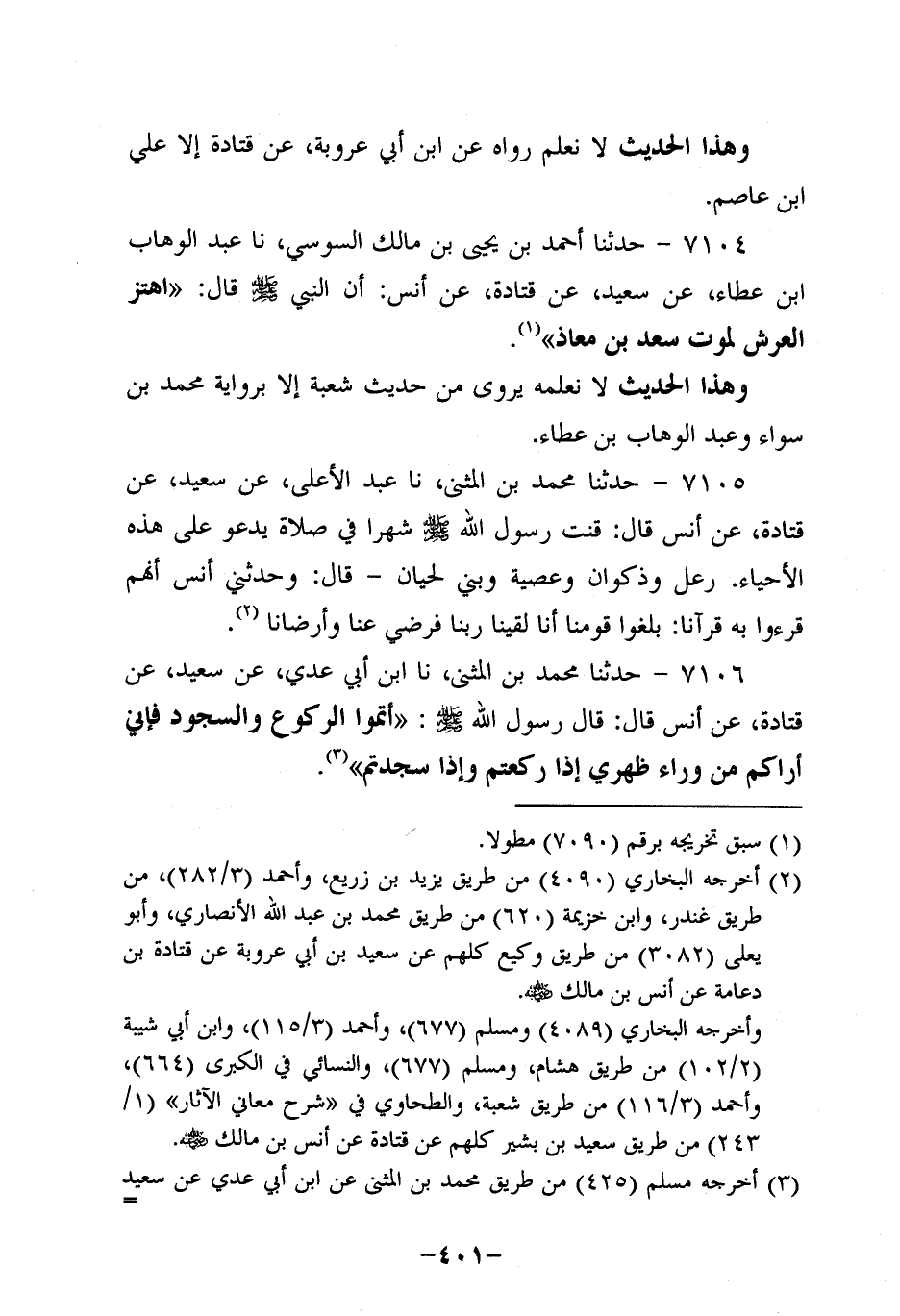 7106- حَدَّثنا محمد بن المثنى، حَدَّثنا ابْنُ أَبِي عَدِيّ، عَنْ سَعِيدٍ، عَن قَتادة، عَن أَنَسٍ، قَالَ: قَالَ رَسُولُ اللَّهِ صَلَّى اللَّهُ عَلَيه وَسَلَّم: أَتِمُّوا الرُّكُوعَ وَالسُّجُودَ فَإِنِّي أَرَاكُمْ مِنْ وَرَاءِ ظَهْرِي إِذَا رَكَعْتُمْ، وَإِذَا سجدتم.