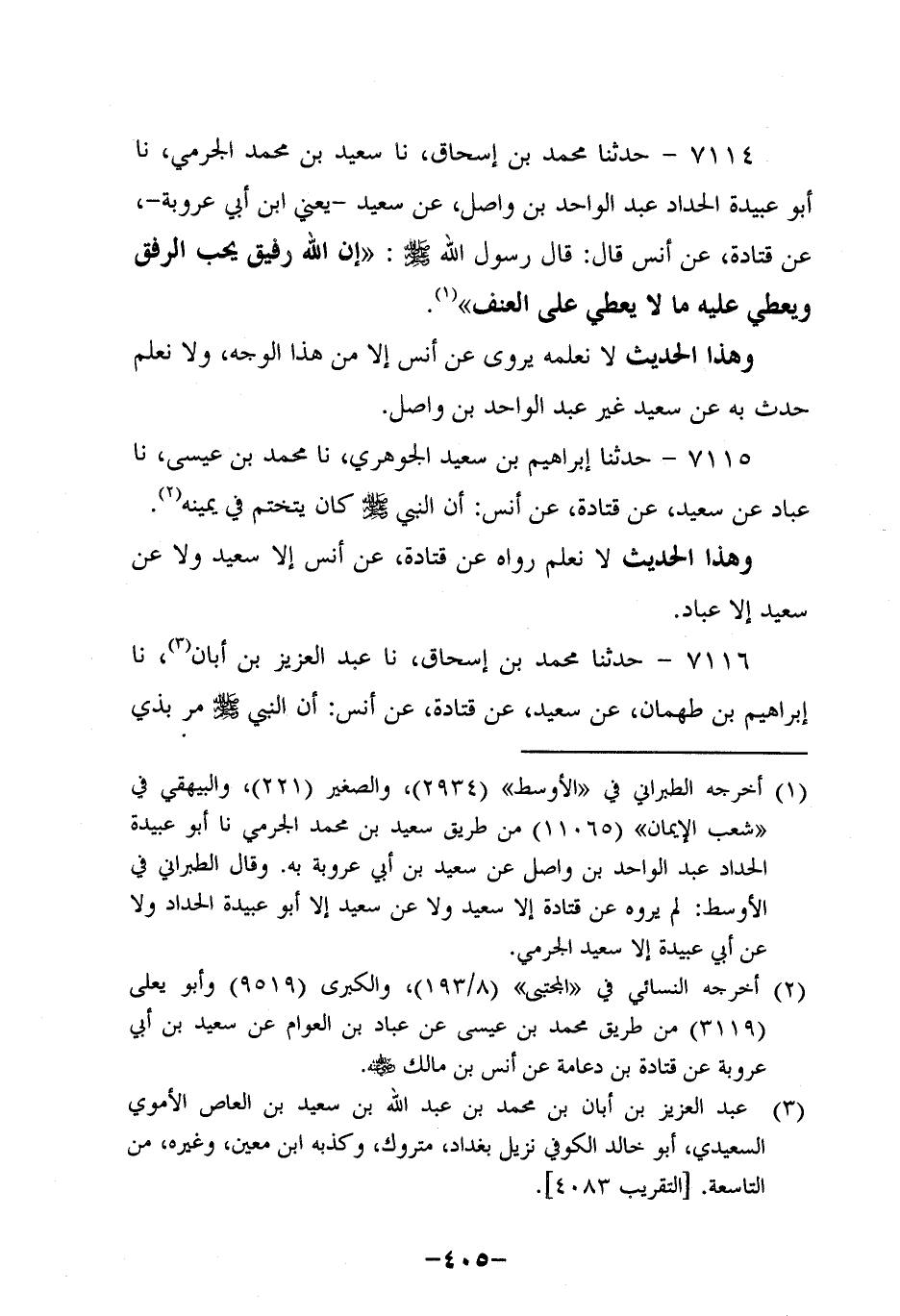 7114- حَدَّثنا محمد بن إسحاق، حَدَّثنا سعيد بن محمد الجرمي، حَدَّثنا أَبُو عُبَيْدَةَ الْحَدَّادُ عَبْدُ الْوَاحِدِ بْنُ وَاصِلٍ، عَنْ سَعِيدٍ، يَعْنِي ابْنَ أَبِي عَرُوبة، عَن قَتادة، عَن أَنَسٍ، قَالَ: قَالَ رَسُولُ اللَّهِ صَلَّى اللَّهُ عَلَيه وَسَلَّم: إِنَّ اللَّهَ رَفِيقٌ يُحِبُّ الرِّفْقَ , وَيُعْطِي عَلَيْهِ مَا لا يُعْطِي عَلَى الْعُنْفِ.