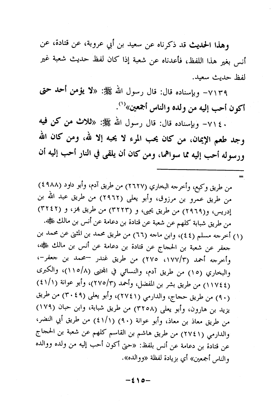 7139- وَبِإِسْنَادِهِ؛ قَالَ: قَالَ رَسُولُ اللَّهِ صَلَّى اللَّهُ عَلَيه وَسَلَّم: لَا يُؤْمِنُ أَحَدٌ حَتَّى أَكُونَ أَحَبَّ إِلَيْهِ مِنْ وَلَدِهِ وَالنَّاسِ أَجْمَعِينَ.