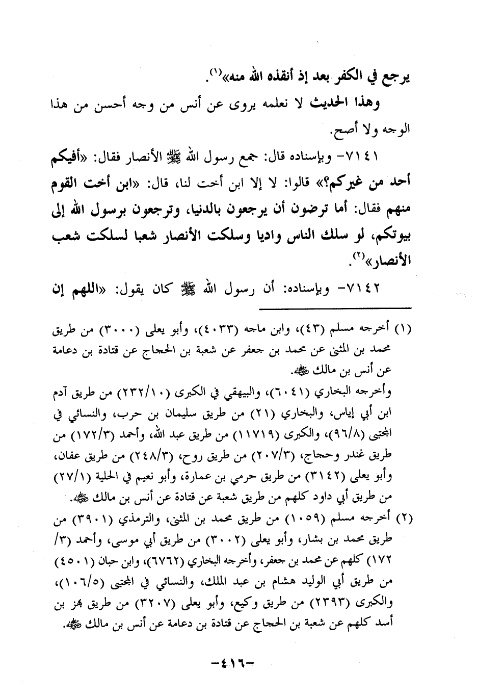 7141- وَبِإِسْنَادِهِ؛ قَالَ: جَمَعَ رَسُولُ اللَّهِ صَلَّى اللَّهُ عَلَيه وَسَلَّم الأَنْصَارَ فَقَالَ: أَفِيكُمْ أَحَدٌ مِنْ غَيْرِكُمْ؟ قَالُوا: لَا إلاَّ ابْنُ أُخْتٍ لَنَا، قَالَ: ابْنُ أُخْتِ الْقَوْمِ مِنْهُمْ فَقَالَ: أَمَا تَرْضَوْنَ أَنْ يَرْجِعُونَ بِالدُّنْيَا وَتَرْجِعُونَ بِرَسُولِ اللَّهِ إِلَى بُيُوتِكُمْ لَوْ سَلَكَ النَّاسُ وَادِيًا وَسَلَكَتِ الأَنْصَارُ شِعْبًا لَسَلَكْتُ شِعْبَ الأَنْصَارِ.