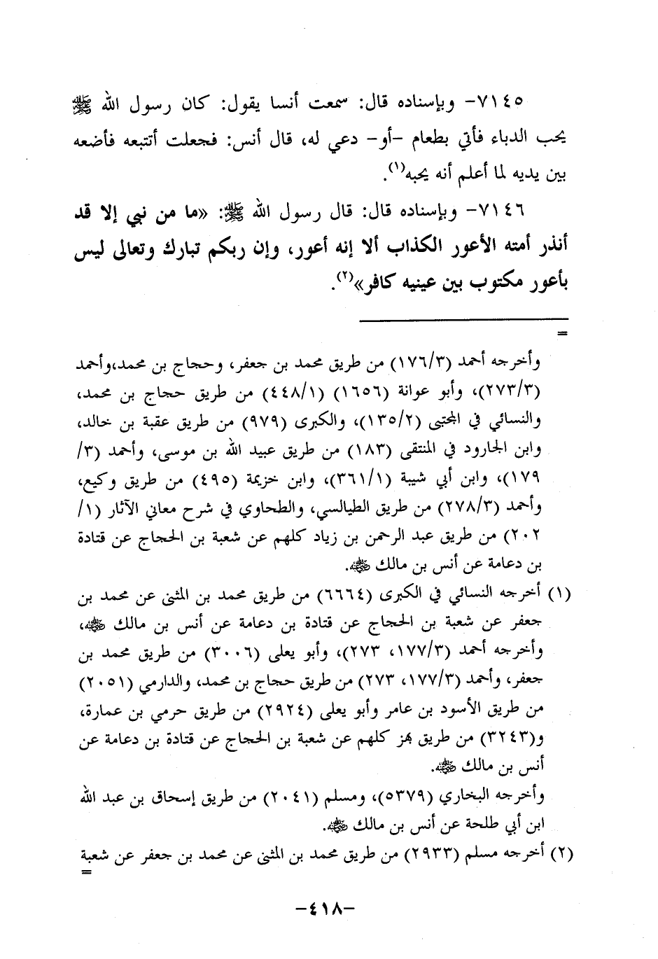 7146- وَبِإِسْنَادِهِ؛ قَالَ: قَالَ رَسُولُ اللَّهِ صَلَّى اللَّهُ عَلَيه وَسَلَّم: مَا مِنْ نَبِيٍّ إلاَّ قَدْ أَنْذَرَ أُمَّتَهُ الأَعْوَرَ الْكَذَّابَ أَلَا إِنَّهُ أَعْوَرُ، وَإن رَبَّكُمْ تَبَارَكَ وَتَعَالَى لَيْسَ بِأَعْوَرَ مَكْتُوبٌ بَيْنَ عَيْنَيْهِ كَافِرٌ.