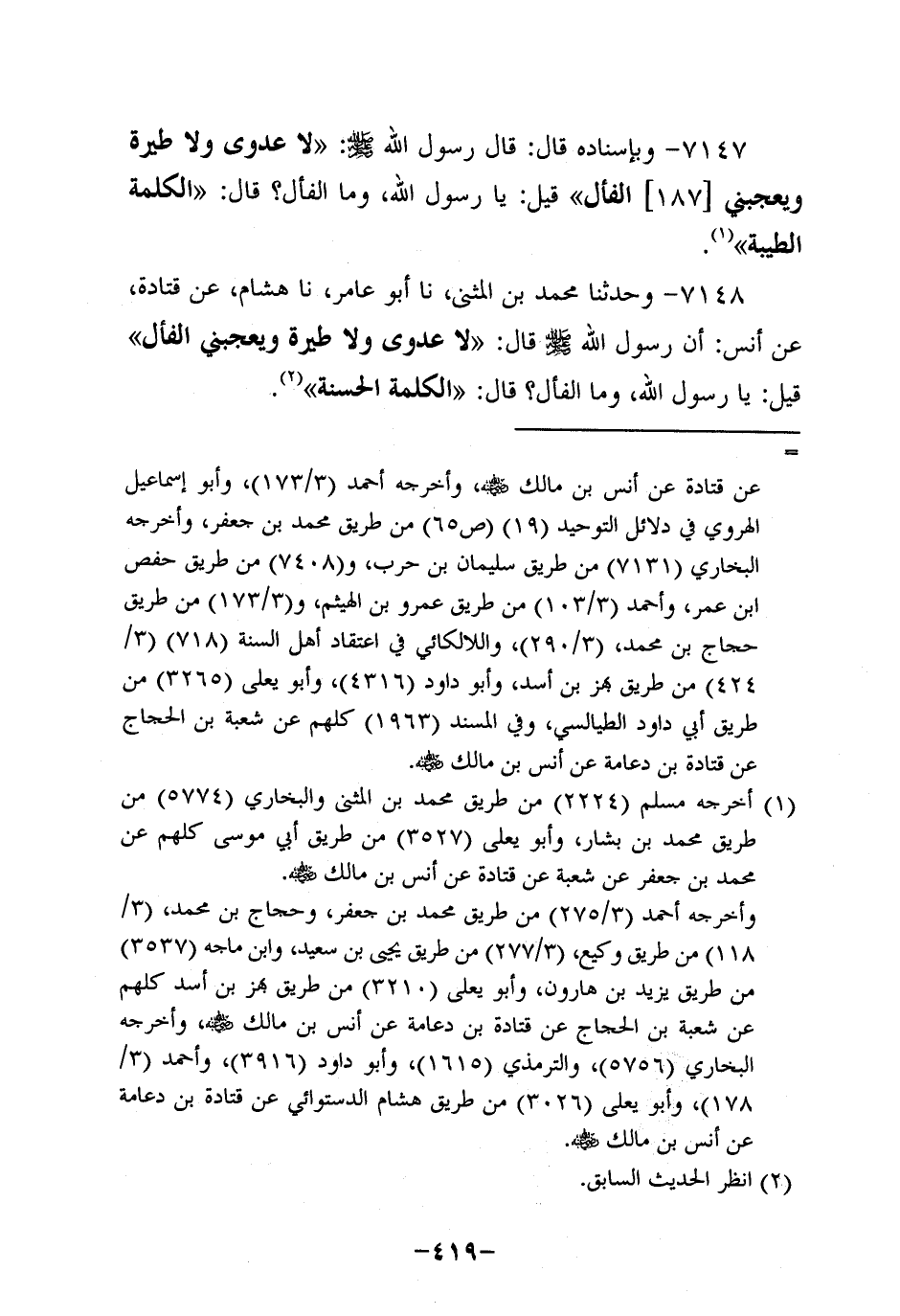 7148- وحدثنا محمد بن المثنى، حَدَّثنا أَبُو عامر، حَدَّثنا هِشَامٌ، عَن قَتادة، عَن أَنَس؛ أَن رَسولَ اللهِ صَلَّى اللَّهُ عَلَيه وَسَلَّم قَالَ: لا عدوى، ولاَ طير , ويعجبني الفأل , قيل: يارسول اللَّهِ وَمَا الْفَأْلُ؟ قَالَ: الْكَلِمَةُ الْحَسَنَةُ.
