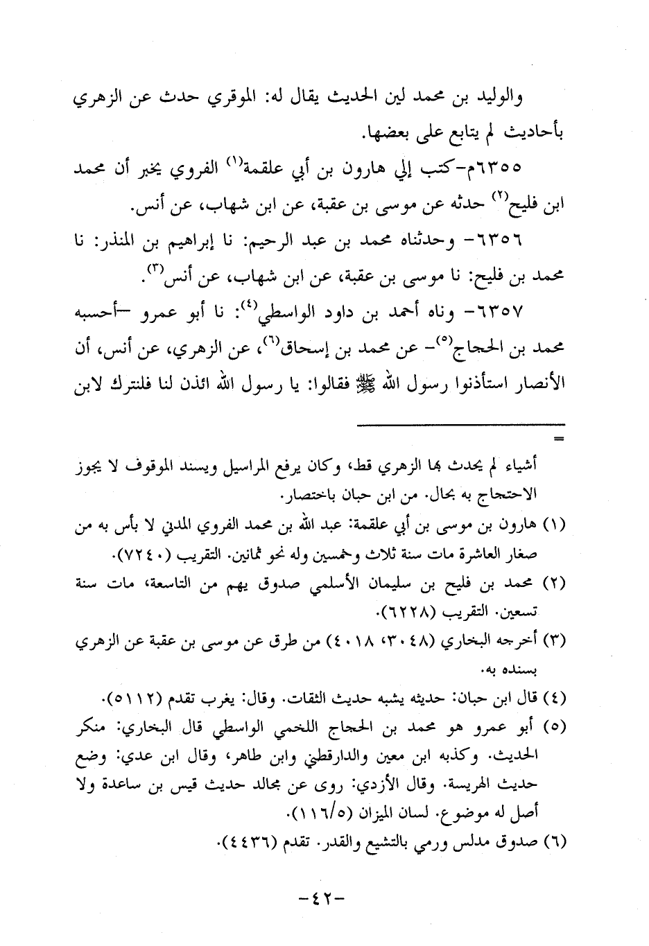 6355م - كَتَبَ إِلَيَّ هَارُونُ بْنُ أَبِي عَلْقَمَةَ الفروي , يخبر أن محمد ابن فُلَيْحٍ , حَدَّثَهُ عَنْ مُوسَى بْنِ عُقْبَةَ، عَن ابْنِ شِهَابٍ، عَن أَنَس.