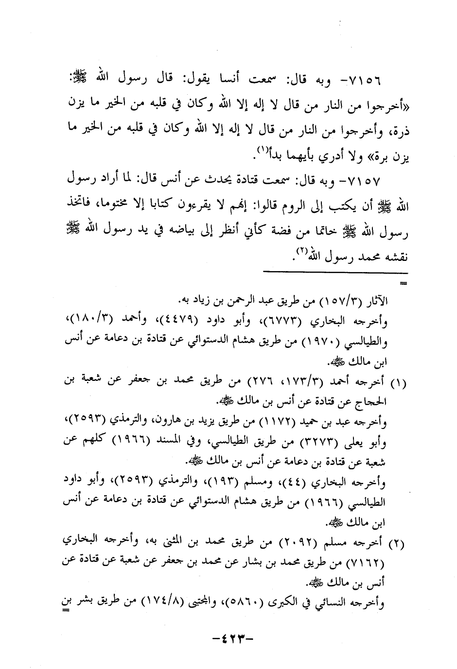 7156- وَبِهِ، قَالَ: سَمِعْتُ أَنَسًا يَقُولُ: قَالَ رَسُولُ اللَّهِ صَلَّى اللَّهُ عَلَيه وَسَلَّم: أَخْرِجُوا مِنَ النَّارِ مَنْ قَالَ لَا إِلَهَ إلاَّ اللَّهُ، وَكان فِي قَلْبِهِ مِنَ الْخَيْرِ مَا يَزِنُ ذَرَّةً , وَأَخْرِجُوا مِنَ النَّارِ مَنْ قَالَ لَا إِلَهَ إلاَّ اللَّهُ، وَكان فِي قَلْبِهِ مِنَ الْخَيْرِ مَا يَزِنُ بُرَّةً، ولاَ أَدْرِي بِأَيِّهِمَا بدأ.