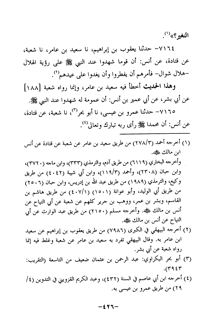 7164- حَدَّثنا يعقوب بن إبراهيم، حَدَّثنا سعيد بن عامر، حَدَّثنا شُعْبَةُ، عَن قَتادة، عَن أَنَس؛ أَن قَوْمًا شَهِدُوا عِنْدَ النَّبِيّ صَلَّى اللَّهُ عَلَيه وَسَلَّم عَلَى رُؤْيَةِ الْهِلالِ - هِلالِ شَوَّالٍ- فَأَمَرَهُمْ أَنْ يُفْطِرُوا وَأَنْ يَغْدُوا عَلَى عِيدِهِمْ.