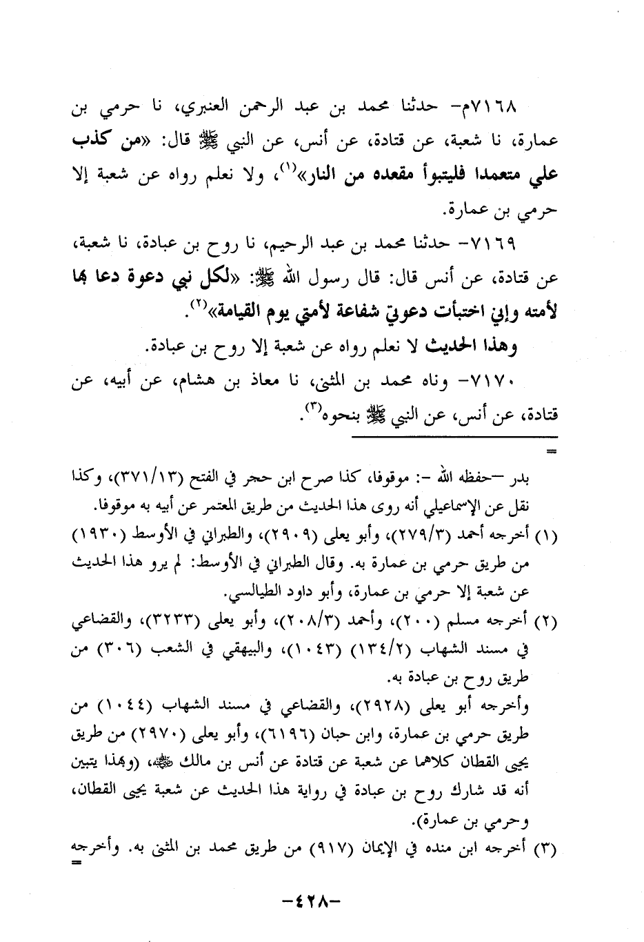 7168م- حَدَّثنا مُحَمَّدُ بْنُ عَبْدِ الرَّحْمَنِ الْعَنْبَرِيُّ، حَدَّثنا حرمي بن عمارة، حَدَّثنا شُعْبَةُ، عَن قَتادة، عَن أَنَس، عَن النَّبِيّ صَلَّى اللَّهُ عَلَيه وَسَلَّم قَالَ: مَنْ كَذَبَ عَلَيَّ مُتَعَمِّدًا فَلْيَتَبَوَّأْ مَقْعَدَهُ مِنَ النَّارِ، ولاَ نعلمُ رَوَاهُ عَنْ شُعْبَةَ إلاَّ حَرَمِيُّ بْنُ عمارة.