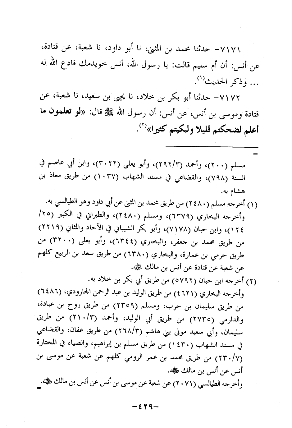 7172- حَدَّثنا أَبُو بكر بن خلاد، حَدَّثنا يَحْيَى بن سعيد، حَدَّثنا شُعْبَةُ، عَن قَتادة وَمُوسَى بْنِ أَنَسٍ، عَن أَنَس؛ أَن رَسولَ اللهِ صَلَّى اللَّهُ عَلَيه وَسَلَّم قَالَ: لَوْ تَعْلَمُونَ مَا أَعْلَمُ , لَضَحِكْتُمْ قَلِيلا وَلَبَكَيْتُمْ كَثِيرًا.