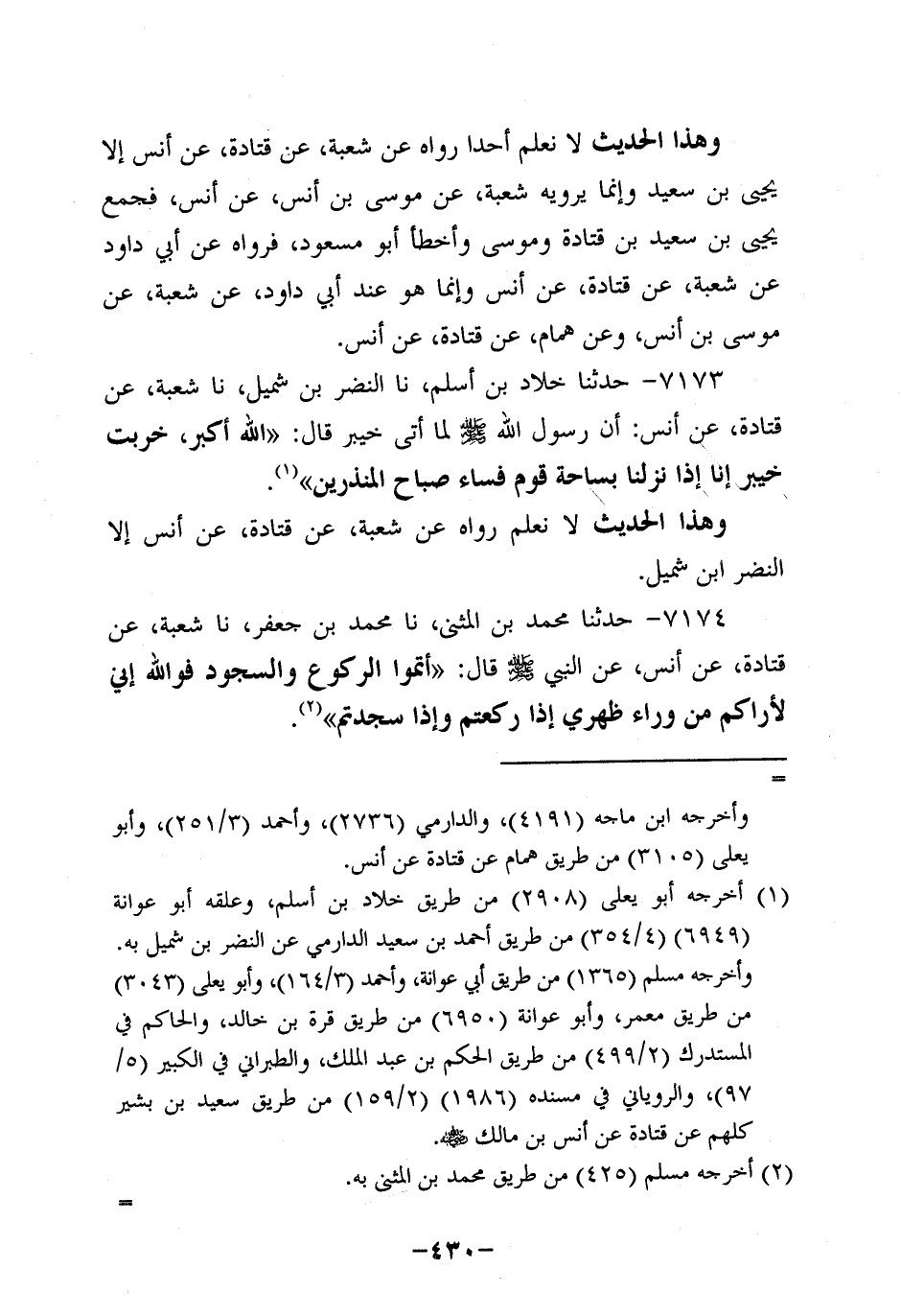 7174- حَدَّثنا محمد بن المثنى، حَدَّثنا محمد بن جعفر، حَدَّثنا شُعْبَةُ، عَن قَتادة، عَن أَنَس، عَن النَّبِيّ صَلَّى اللَّهُ عَلَيه وَسَلَّم قَالَ: أَتِمُّوا الرُّكُوعَ والسجود , فوالله إني لأراكم من رواء ظَهْرِي إِذَا رَكَعْتُمْ، وَإِذَا سَجَدْتُمْ.