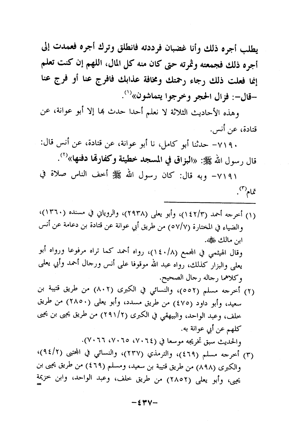 7190- حَدَّثنا أَبُو كامل، حَدَّثنا أَبُو عَوَانة، عَن قَتادة، عَن أَنَسٍ، قَالَ: قَالَ رَسُولُ اللَّهِ صَلَّى اللَّهُ عَلَيه وَسَلَّم: الْبُزَاقُ فِي الْمَسْجِدِ خَطِيئَةٌ وَكَفَّارَتُهَا دَفْنُهَا.