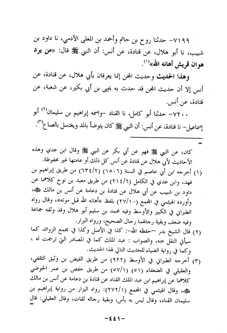 7200- حَدَّثنا أَبُو كامل، حَدَّثنا الْقَنَّادُ - وَاسْمُهُ إِبْرَاهِيمُ بْنُ سُلَيْمَانَ أَبُو إِسْمَاعِيلَ، حَدَّثنا قَتَادَةَ، عَن أَنَس؛ أَنَّ النَّبِيّ صَلَّى اللَّهُ عَلَيه وَسَلَّم كَانَ يَتَوَضَّأُ بِالْمُدِّ وَيَغْتَسِلُ بِالصَّاعِ.