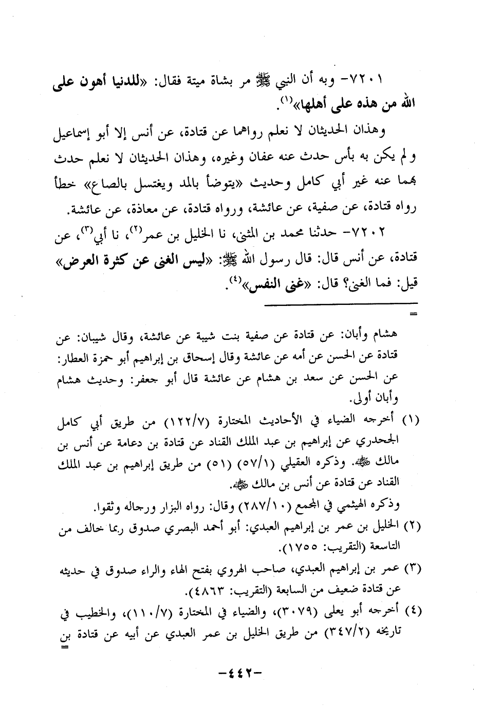 7202- حَدَّثنا محمد بن المثنى، حَدَّثنا الخليل بن عُمَر، حَدَّثنا أَبِي، عَن قَتادة، عَن أَنَسٍ، قَالَ: قَالَ رَسُولُ اللَّهِ صَلَّى اللَّهُ عَلَيه وَسَلَّم: لَيْسَ الْغِنَى عَنْ كَثْرَةِ الْعَرَضِ قِيلَ: فَمَا الْغِنَى؟ قَالَ: غِنَى النَّفْسِ.