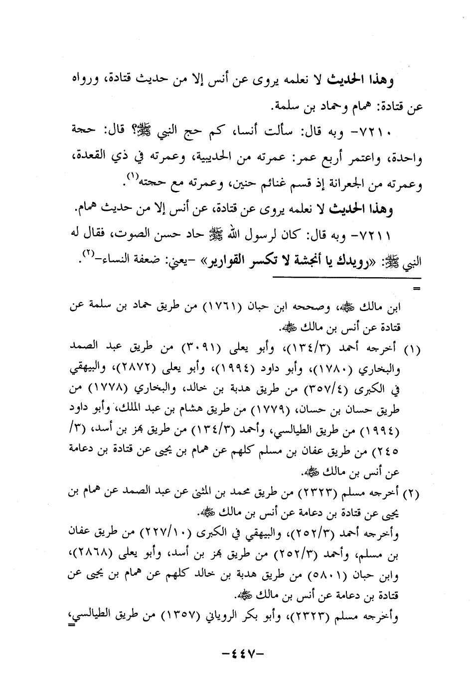 7210- وَبِهِ قَالَ: سَأَلْتُ أَنَسًا كَمْ حَجَّ النَّبِيّ صَلَّى اللَّهُ عَلَيه وَسَلَّم؟ قَالَ: حَجَّةً وَاحِدَةً وَاعْتَمَرَ أَرْبَعَ عُمَر: عُمْرَتُهُ مِنَ الْحُدَيْبِيَةِ وَعُمْرَتُهُ فِي ذِي الْقِعْدَةِ وَعُمْرَتُهُ مِنَ الْجِعْرَانَةِ إِذْ قَسَّمَ غَنَائِمَ حُنَيْنٍ وَعُمْرَتُهُ مَعَ حَجَّتِهِ.