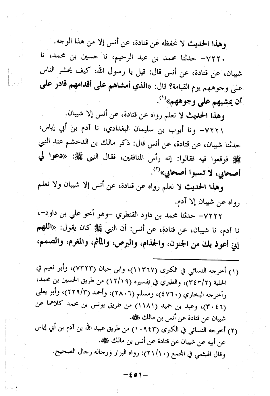 7220- حَدَّثنا مُحَمد بن عَبد الرحيم، حَدَّثنا حسين بن مُحَمد، حَدَّثنا شَيْبَانُ، عَن قَتادة، عَن أَنَسٍ، قَالَ: قِيلَ يَا رَسولَ اللهِ كَيْفَ يُحْشَرُ النَّاسُ عَلَى وُجُوهِهِمْ يَوْمَ الْقِيَامَةِ؟ قَالَ: الَّذِي أَمْشَاهُمْ عَلَى أَقْدَامِهِمْ قَادِرٌ عَلَى أَنْ يُمْشِيَهُمْ عَلَى وُجُوهِهِمْ.