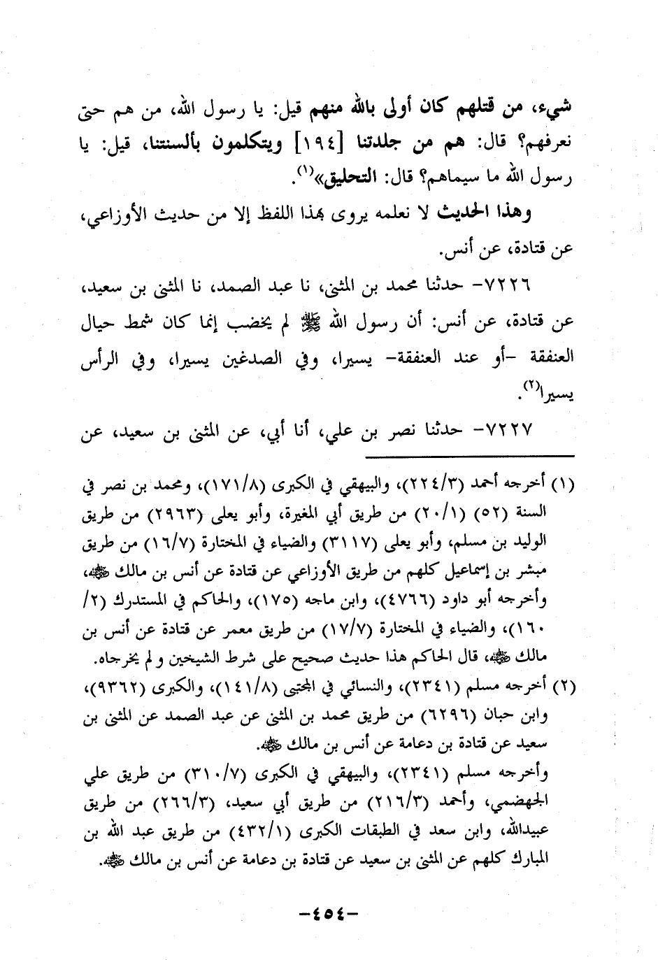 7226- حَدَّثنا مُحَمَّدُ بْنَ الْمُثَنَّى، حَدَّثنا عَبد الصمد، حَدَّثنا الْمُثَنَّى بْنُ سَعِيد، عَن قَتادة، عَن أَنَس؛ أَن رَسولَ اللهِ صَلَّى اللَّهُ عَلَيه وَسَلَّم لَمْ يُخَضِّبْ إِنَّمَا كَانَ شَمَطٌ حِيَالَ الْعَنْفَقَةِ أَوْ عِنْدَ الْعَنْفَقَةِ يَسِيرًا وَفِي الصُّدْغَيْنِ يَسِيرًا وَفِي الرَّأْسِ يَسِيرًا.