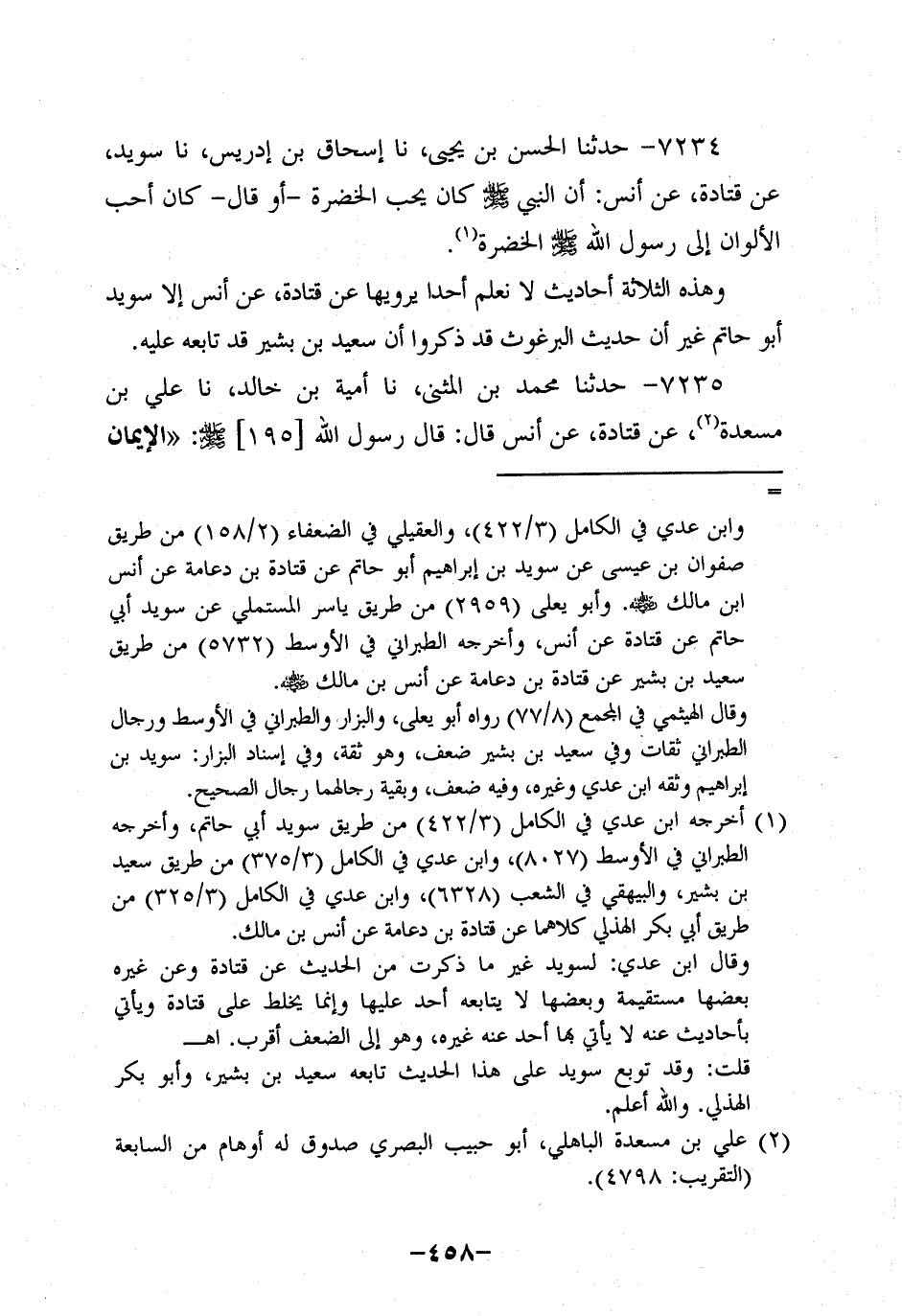 7234- حَدَّثنا الحسن بن يَحْيَى، حَدَّثنا إسحاق بن إدريس، حَدَّثنا سُوَيْدٌ، عَن قَتادة، عَن أَنَس؛ أَن النَّبِيّ صَلَّى اللَّهُ عَلَيه وَسَلَّم كَانَ يُحِبُّ الْخُضْرَةَ، أَوْ قَالَ - كَانَ أَحَبُّ الأَلْوَانِ إِلَى رَسُولِ اللَّهِ صَلَّى اللَّهُ عَلَيه وَسَلَّم الْخُضْرَةَ.