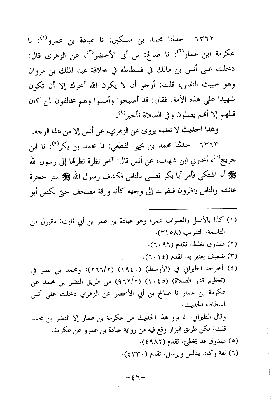 6362- حَدَّثنا محمد بن مسكين، حَدَّثنا عبادة بن عَمْرو، حَدَّثنا عكرمة بن عمار، حَدَّثنا صَالِحُ بْنُ أَبِي الأَخْضَرِ، عَن الزُّهْرِيّ قَالَ: دَخَلْتُ عَلَى أَنَسِ بْنِ مَالِكٍ فِي فُسْطَاطِهِ فِي خِلافَةِ عَبْدِ الْمَلِكِ بْنِ مَرْوَانَ، وهُو خَبِيثُ النَّفْسِ قُلْتُ: أَرْجُو أَنْ لا يَكُونَ اللَّهُ أَخَّرَكَ إلاَّ أَنْ تَكُونَ شَهِيدًا عَلَى هَذِهِ الأُمَّةِ فَقَالَ: قَدْ أَصْبَحُوا وَأَمْسَوْا وَهُمْ مُخَالِفُونَ لِمَنْ كَانَ قَبْلَهُمْ إلاَّ أَنَّهُمْ يُصَلُّونَ، وَفِي الصَّلاةِ تَأْخِيرٌ.