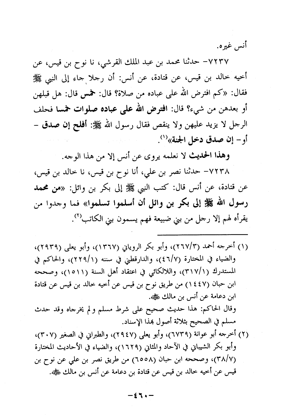 7237- حَدَّثنا مُحَمد بن عَبد الملك القرشي، حَدَّثنا نُوحُ بْنُ قَيْسٍ، عَن أَخِيهِ خَالِدِ بْنِ قَيْسٍ، عَن قَتادة، عَن أَنَس؛ أَن رَجُلا جَاءَ إِلَى النَّبِيّ صَلَّى اللَّهُ عَلَيه وَسَلَّم فَقَالَ: كَمِ افْتَرَضَ اللَّهُ عَلَى عِبَادِهِ مِنَ الصَّلاةِ؟ قَالَ: خَمْس , قَالَ: هَلْ قَبْلَهُنَّ أَوْ بَعْدَهُنَّ مِنْ شَيْءٌ؟ قَالَ: افْتَرَضَ اللَّهُ عَلَى عِبَادِهِ صَلَوَاتٍ خَمْسًا , فَحَلَفَ الرَّجُلُ لَا يَزِيدُ عَلَيْهِنَّ، ولاَ يَنْقُصُ فَقَالَ رَسُولُ اللَّهِ صَلَّى اللَّهُ عَلَيه وَسَلَّم: أَفْلَحَ إِنْ صَدَقَ، أَوْ إِنْ صَدَقَ دَخَلَ الْجَنَّةَ.