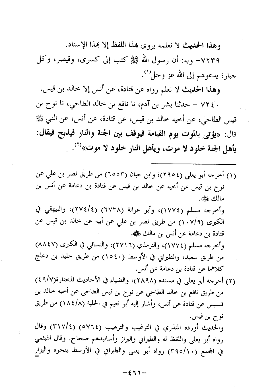 7240- حَدَّثنا بِشْر بن آدم، حَدَّثنا نافع بن خالد الطاحي، حَدَّثنا نُوحُ بْنُ قَيْسٍ الطَّاحِيُّ عَنْ أَخِيهِ خَالِدِ بْنِ قَيْسٍ، عَن قَتادة، عَن أَنَس، عَن النَّبِيّ صَلَّى اللَّهُ عَلَيه وَسَلَّم قَالَ: يُؤْتَى بِالْمَوْتِ يَوْمَ الْقِيَامَةِ فَيُوقَفُ بَيْنَ الْجَنَّةِ وَالنَّارِ فيذبح فيقال: يا أهل الجنة خلود لا موت، ويا أهل النَّارِ خُلُودٌ لَا مَوْتَ.