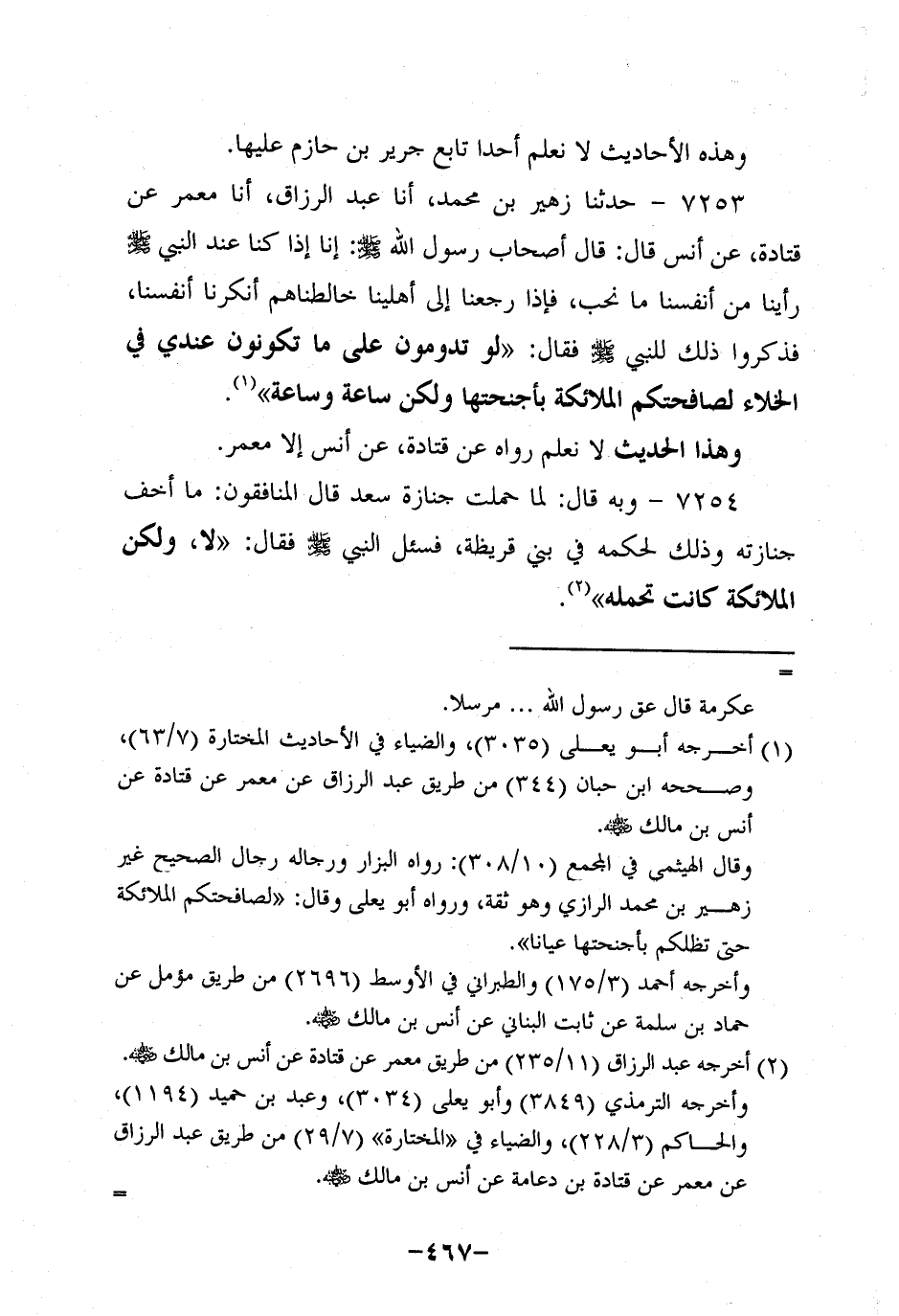 7253- حَدَّثنا زهير بن مُحَمد، أخبرَنا عَبد الرَّزَّاق، أخبرَنا مَعْمَر، عَن قَتادة، عَن أَنَسٍ، قَالَ: قَالَ أَصْحَابُ رَسُولِ اللَّهِ صَلَّى اللَّهُ عَلَيه وَسَلَّم: إِنَّا إِذَا كُنَّا عِنْدَ النَّبِيّ صَلَّى اللَّهُ عَلَيه وَسَلَّم رَأَيْنَا مِنْ أَنْفُسِنَا مَا نُحِبُّ فإذا رجعنا إلى أهلينا خالطناهم أَنْكَرْنَا أَنْفُسَنَا فَذَكَرُوا ذَلِكَ لِلنَّبِيِّ صَلَّى اللَّهُ عَلَيه وَسَلَّم فَقَالَ: لَوْ تَدُومُونَ عَلَى مَا تَكُونُونَ عِنْدِي فِي الْخَلاءِ لَصَافَحَتْكُمُ الْمَلائِكَةُ بِأَجْنِحَتِهَا، وَلكن سَاعَةً وَسَاعَةً.