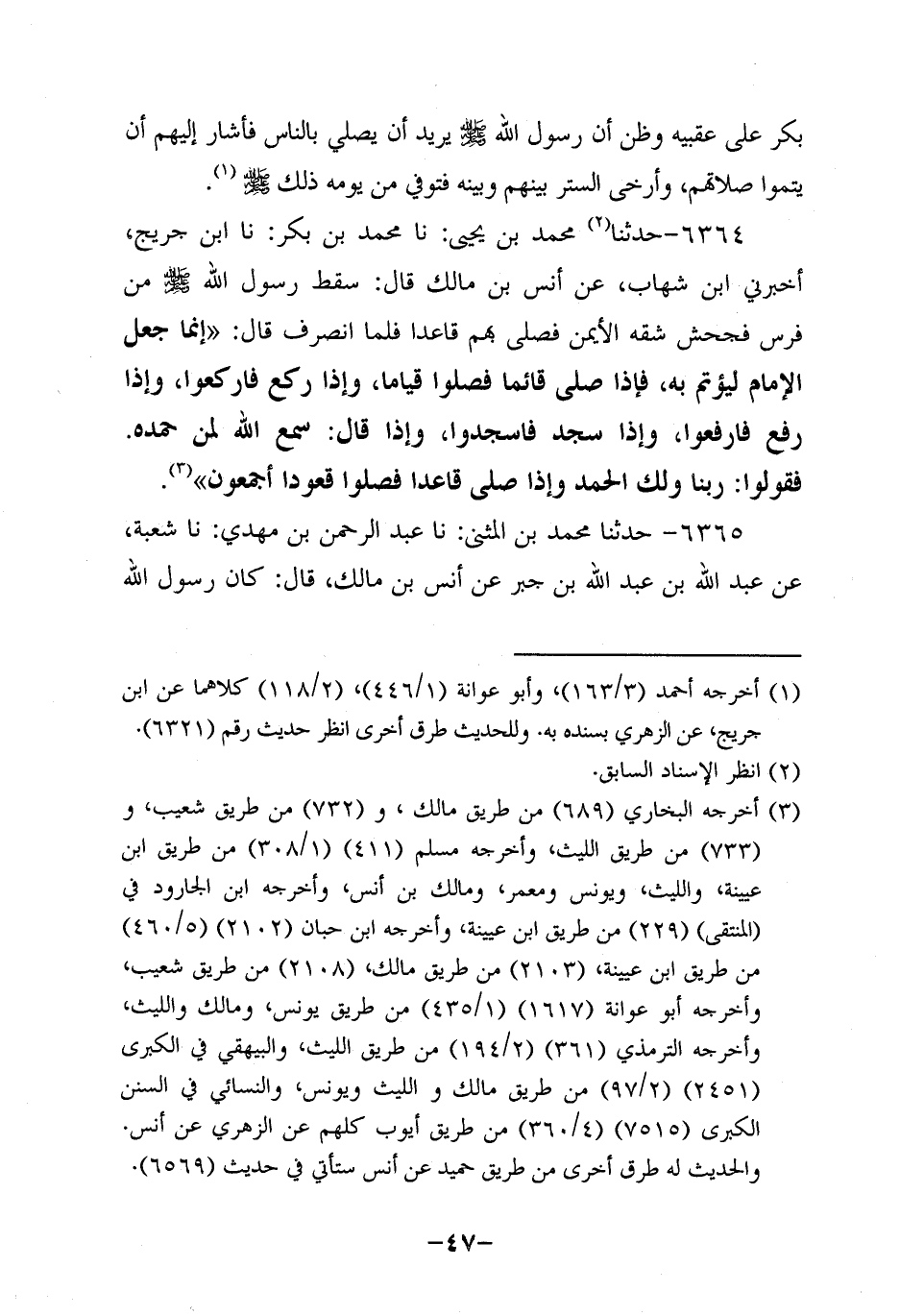 6364- حَدَّثنا محمد بن يحيي، حَدَّثنا محمد بن بكر، حَدَّثنا ابْنُ جُرَيج , أَخْبَرَنِي ابْنُ شِهَابٍ، عَن أَنَس بْنِ مَالِكٍ قَالَ: سَقَطَ رَسُولُ اللَّهِ صَلَّى اللَّهُ عَلَيْهِ وَسَلَّمَ مِنْ فَرَسٍ فَجُحِشَ شِقُّهُ الأَيْمَنُ فَصَلَّى بِهِمْ قَاعِدًا فَلَمَّا انْصَرَفَ قَالَ: إِنَّمَا جُعِلَ الإِمَامُ لِيُؤْتَمَّ بِهِ فَإِذَا صَلَّى قَائِمًا فَصَلُّوا قِيَامًا، وَإِذَا رَكَعَ فَارْكَعُوا، وَإِذَا رَفَعَ فَارْفَعُوا، وَإِذَا سَجَدَ فَاسْجُدُوا، وَإِذَا قَالَ: سَمِعَ اللَّهُ لِمَنْ حَمِدَهُ فَقُولُوا: رَبَّنَا وَلَكَ الْحَمْدُ، وَإِذَا صَلَّى قَاعِدًا فَصَلُّوا قُعُودًا أَجْمَعُونَ.
