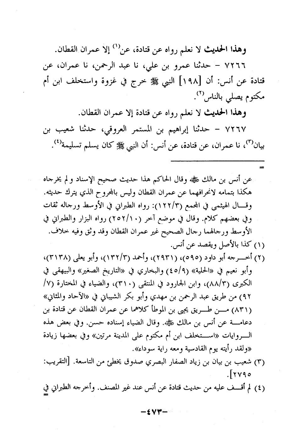 7266- حَدَّثَنا عَمْرُو بْنُ عَلِيٍّ، حَدَّثنا عَبد الرحمن، حَدَّثنا عِمْرَانُ، عَن قَتادة، عَن أَنَس؛ أَن النَّبِيّ صَلَّى اللَّهُ عَلَيه وَسَلَّم خَرَجَ فِي غَزْوَةٍ وَاسْتَخْلَفَ ابْنَ أُمِّ مَكْتُومٍ يُصَلِّي بِالنَّاسِ.
