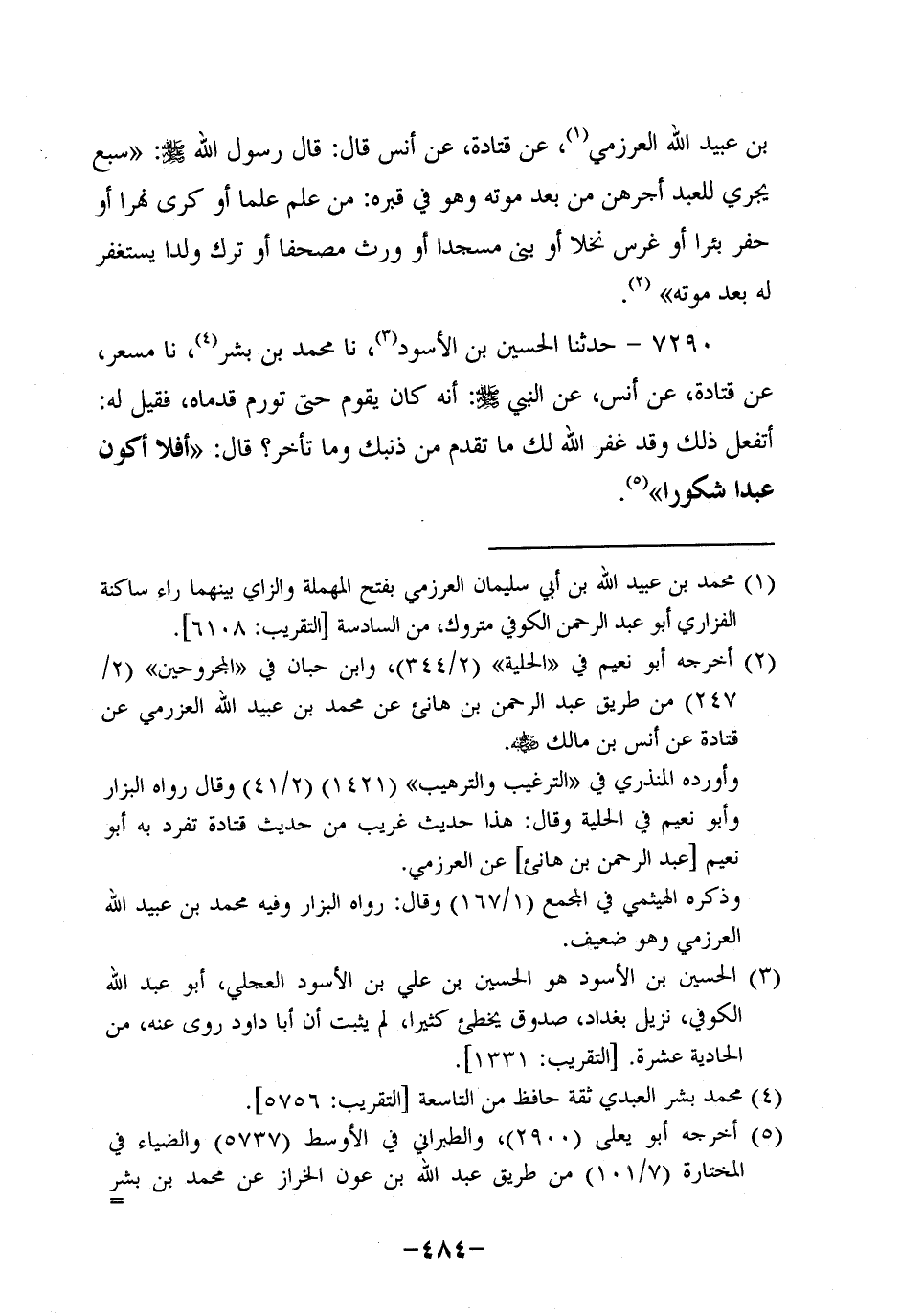 7290- حَدَّثنا الحسين بن الأسود، حَدَّثنا مُحَمد بن بشر، حَدَّثنا مِسْعَرٌ، عَن قَتادة، عَن أَنَس، عَن النَّبِيّ صَلَّى اللَّهُ عَلَيه وَسَلَّم؛ أَنَّه كَانَ يَقُومُ حَتَّى تَوَرَّمَ قَدَمَاهُ فَقِيلَ لَهُ: أَتَفْعَلُ ذَلِكَ وَقَدْ غَفَرَ اللَّهُ لَكَ مَا تَقَدَّمَ مِنْ ذَنْبِكَ وَمَا تَأَخَّرَ؟ قَالَ: أَفَلا أَكُونُ عَبدا شَكُورًا.