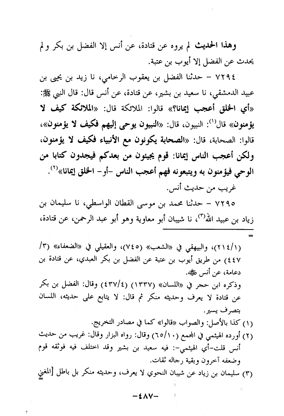 7294- حَدَّثنا الفضل بن يعقوب الرخامي، حَدَّثنا زيد بن يَحْيَى بن عُبَيد الدمشقي، حَدَّثنا سَعِيد بْنِ بَشِيرٍ، عَن قَتادة، عَن أَنَسٍ، قَالَ: قَالَ النَّبِيّ صَلَّى اللَّهُ عَلَيه وَسَلَّم: أَيُّ الْخَلْقِ أَعْجَبُ إِيمَانًا؟ قَالُوا: الْمَلائِكَةُ، قَالَ: الْمَلائِكَةُ كَيْفَ لَا يُؤْمِنُونَ؟ قَالَ: النَّبِيُّونَ، قَالَ: النَّبِيُّونَ يُوحَى إِلَيْهِمْ فَكَيْفَ لَا يُؤْمِنُونَ؟ قَالُوا: الصَّحَابَةُ، قَالَ: الصَّحَابَةُ يَكُونُونَ مَعَ الأَنْبِيَاءِ، فَكَيْفَ لا يُؤْمِنُونَ، وَلكن أَعْجَبَ النَّاسِ إِيمَانًا: قَوْمٌ يجيؤون مِنْ بَعْدِكُمْ، فَيَجِدُونَ كِتَابًا مِنَ الْوَحْيِ، فَيُؤْمِنُونَ بِهِ، وَيَتَّبِعُونَهُ، فَهُمْ أَعْجَبُ النَّاسِ، أَوِ الْخَلْقِ، إِيمَانًا.