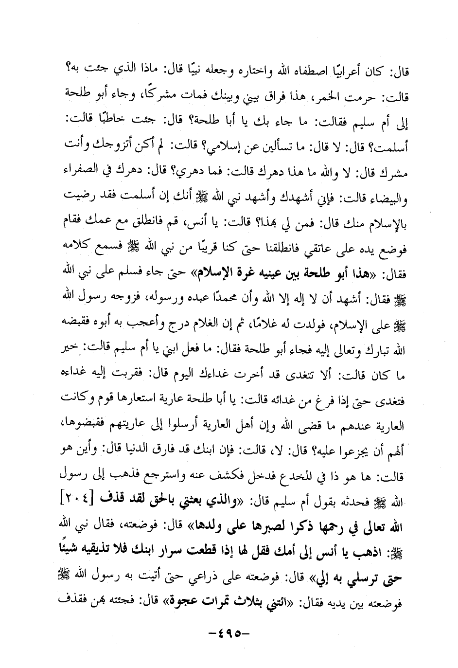 فَقَامَ فَوَضَعَ يَدَهُ عَلَى عَاتِقِي، فَانْطَلَقْنَا، حَتَّى كُنَّا قَرِيبًا مِنْ نَبِيِّ اللَّهِ صَلَّى اللَّهُ عَلَيه وَسَلَّم، فَسَمِعَ كَلامَهُ، فَقَالَ: هَذَا أَبُو طَلْحَةَ، بَيْنَ عَيْنَيْهِ غرةُ الإِسْلامِ، حَتَّى جَاءَ، فَسَلَّمَ عَلَى نَبِيِّ اللَّهِ صَلَّى اللَّهُ عَلَيه وَسَلَّم، فَقَالَ: أَشْهَدُ أَنْ لا إِلَهَ إلاَّ اللَّهُ، وَأَنَّ مُحَمَّدًا عَبده وَرَسُولُهُ، فَزَوَّجَهُ رسولُ اللَّهِ صَلَّى اللَّهُ عَلَيه وَسَلَّم عَلَى الإِسْلامِ، فَوَلَدَتْ لَهُ غُلَامًا، ثُمَّ إِن الْغُلَامَ دَرَجَ، وَأُعْجِبَ بِهِ أَبُوهُ، فَقَبَضَهُ اللَّهُ تَبَارَكَ وَتَعَالَى إِلَيْهِ، فَجَاءَ أَبُو طَلْحَةَ، فَقَالَ: مَا فَعَلَ ابْنِي يَا أُم سُلَيْمٍ؟ قَالَتْ: خَيْرُ مَا كَانَ، قَالَتْ: أَلَا تَتَغَدَّى، قَدْ أَخَّرْتُ غَدَاءَكَ الْيَوْمَ؟ قَالَ: فَقَرَّبَتْ إِلَيْهِ غَدَاءَهُ، فَتَغَدَّى، حَتَّى إِذَا فَرَغَ مِنْ غَدَائِهِ، قَالَتْ: يَا أَبَا طَلْحَةَ، عاريةٌ اسْتَعَارَهَا قَوْمٌ، وَكَانَتِ الْعَارِيَةُ عِنْدَهُمْ مَا قَضَى اللَّهُ، وَإن أَهْلَ الْعَارِيَةِ أَرْسَلُوا إِلَى عَارِيَتِهِمْ فَقَبَضُوهَا، أَلَهُمْ أَنْ يَجْزَعُوا عَلَيْهِ؟ قَالَ: لا، قَالَتْ: فَإِنَّ ابْنَكَ قَدْ فَارَقَ الدُّنْيَا، قَالَ: وَأَيْنَ هُوَ؟ قَالَتْ: هَا هُوَ ذَا فِي الْمَخْدَعِ، فَدَخَل، فَكَشَفَ عَنْهُ، وَاسْتَرْجَعَ،