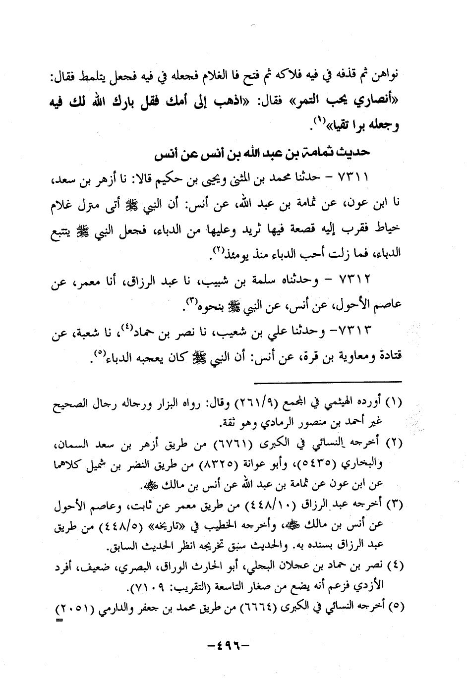 7311- حَدَّثنا مُحَمَّدُ بْنَ الْمُثَنَّى وَيَحْيَى بن حكيم، قَالاَ: حَدَّثنَا أزهر بن سَعْد، حَدَّثنا ابْنُ عَوْنٍ عَنْ ثُمَامَةَ بْنِ عَبد اللَّهِ، عَن أَنَس؛ أَن النَّبِيّ صَلَّى اللَّهُ عَلَيه وَسَلَّم أَتَى مَنْزِلَ غُلامٍ خَيَّاطٍ فَقُرِّبَ إِلَيْهِ قَصْعَةٌ فِيهَا ثَرِيدٌ وَعَلَيْهَا مِنَ الدُّبَّاء فَجَعَلَ النَّبِيّ صَلَّى اللَّهُ عَلَيه وَسَلَّم يَتَتَبَّعُ الدُّبَّاء فَمَا زِلْتُ أُحِبُّ الدُّبَّاء مُنْذُ يَوْمَئِذٍ.