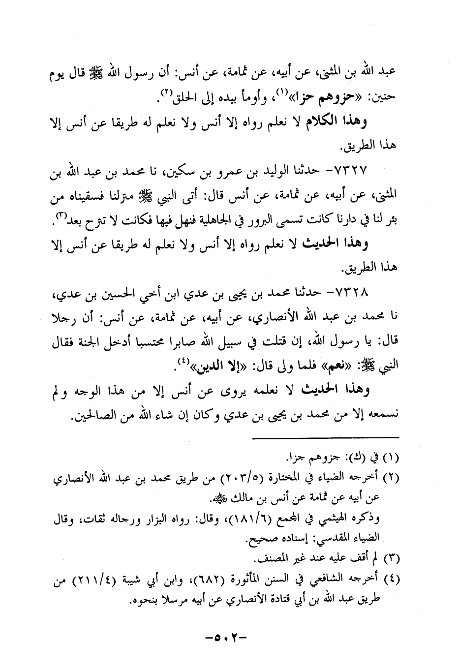 7328- حَدَّثنا مُحَمد بْنُ يَحْيَى بْنِ عَدِيّ ابْنُ أخي الحسين بن عَدِيّ، حَدَّثنا مُحَمد بْنُ عَبد اللَّهِ الأَنْصَارِيُّ، عَن أَبِيه عَنْ ثُمَامَةَ، عَن أَنَس؛ أَن رَجُلا قَالَ: يَا رَسولَ اللهِ إِنْ قُتِلْتُ فِي سَبِيلِ اللَّهِ صَابِرًا مُحْتَسِبًا أَدْخُلُ الْجَنَّةَ فَقَالَ النَّبِيّ صَلَّى اللَّهُ عَلَيه وَسَلَّم: نَعَمْ فَلَمَّا وَلَّى قَالَ: إلاَّ الدَّيْنَ.