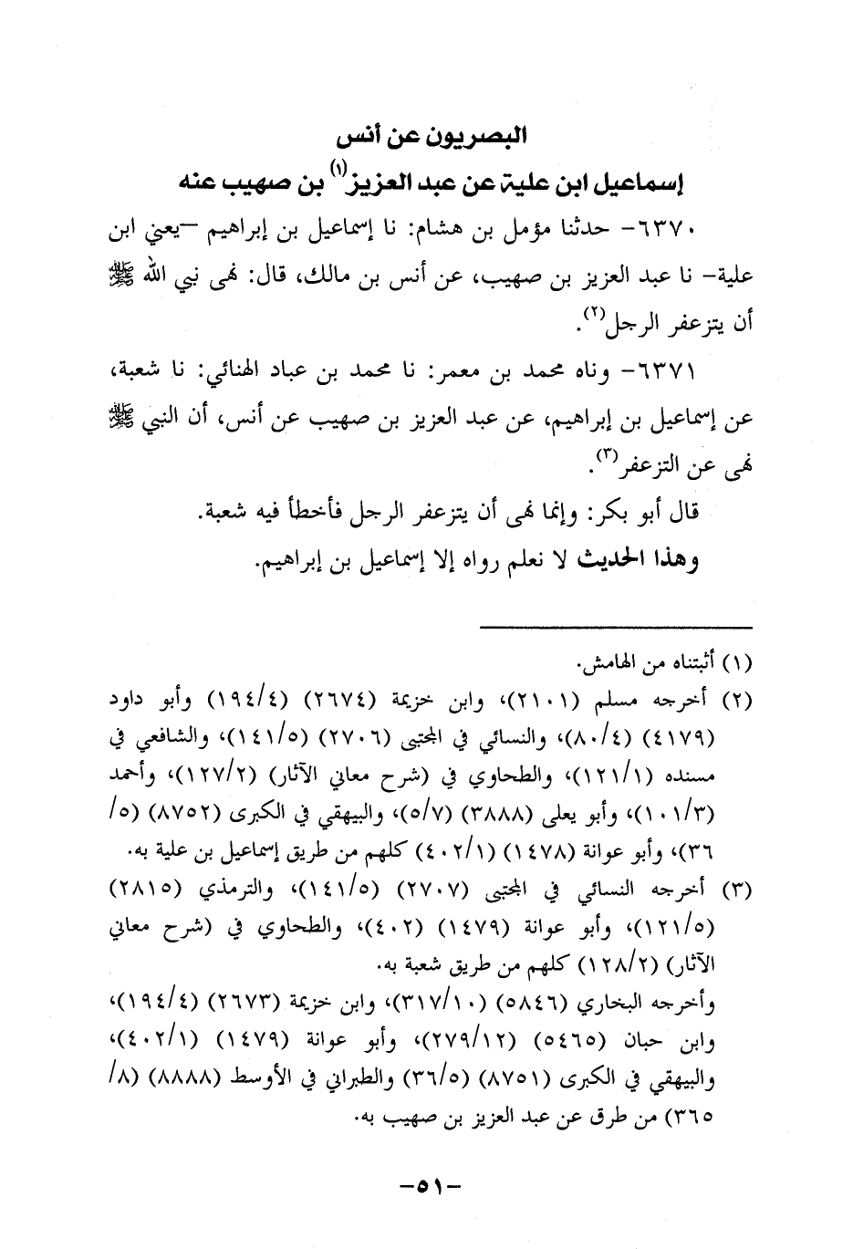6370- حَدَّثنا مُؤَمَّل بن هشام، حَدَّثنا إسماعيل بن إبراهيم، يعني ابن علية، حَدَّثنا عَبْدُ الْعَزِيزِ بْنُ صُهَيْبٍ، عَن أَنَس بْنِ مَالِكٍ قَالَ: نَهَى نَبِيُّ اللَّهِ صَلَّى اللَّهُ عليه وسلم أن يتزعفر الرجل.