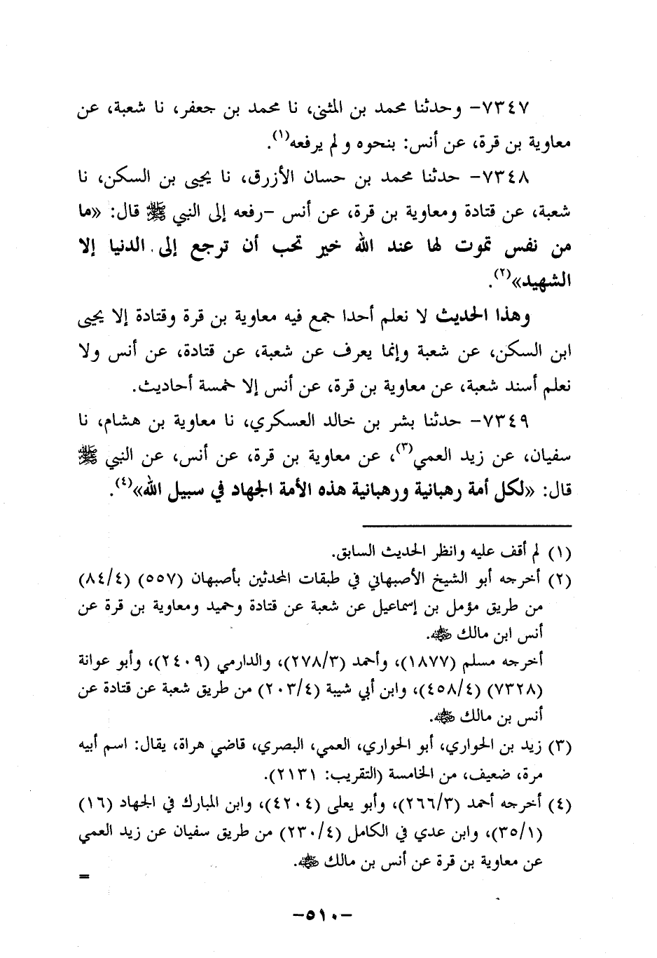 7347- حَدَّثنا مُحَمد بن حسان الأزرق، حَدَّثنا يَحْيَى بن السكن، حَدَّثنا شُعْبَةُ، عَن قَتادة وَمُعَاوِيَةَ بْنِ قُرَّةَ، عَن أَنَس رَفَعَهُ إِلَى النَّبِيّ صَلَّى اللَّهُ عَلَيه وَسَلَّم قَالَ: مَا مِنْ نَفْسٍ تَمُوتُ لَهَا عِنْدَ اللَّهِ خَيْرٌ تُحِبُّ أَنْ تَرْجِعَ إِلَى الدُّنْيَا إلاَّ الشَّهِيدُ.