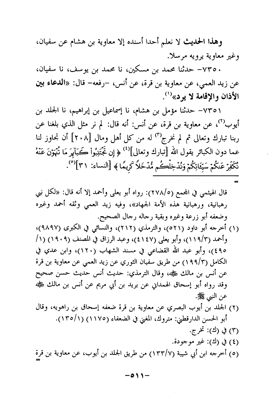7350- حَدَّثنا مُحَمد بن مسكين، حَدَّثنا مُحَمد بن يوسف، حَدَّثنا سُفيان، عَن زَيْدٍ الْعَمِّيِّ عَنْ مُعَاوِيَةَ بْنِ قُرَّةَ، عَن أَنَس رَفَعَهُ قَالَ: الدُّعَاءُ بَيْنَ الأَذَانِ وَالإِقَامَةِ لَا يُرَدُّ.
