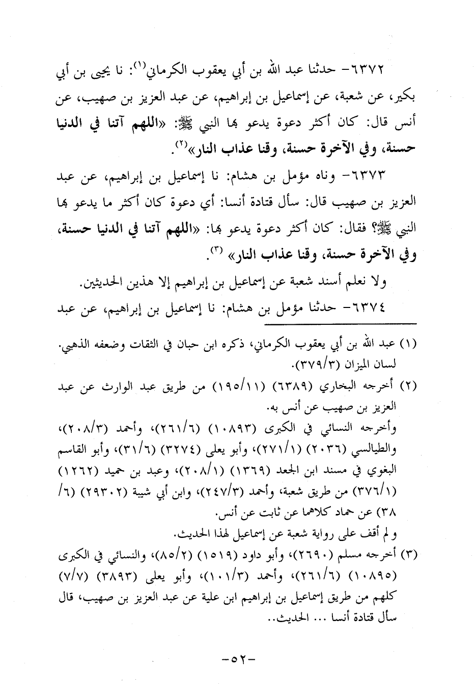 6372- حَدَّثنا عَبْدُ اللَّهِ بْنُ أَبِي يَعْقُوبَ الْكَرْمَانِيُّ، حَدَّثنا يَحْيَى بْنُ أَبِي بُكَيْرٍ , عَنْ شُعْبَةَ , عَنْ إِسْمَاعِيلَ بْنِ إِبْرَاهِيمَ , عَنْ عَبْدِ الْعَزِيزِ بْنِ صُهَيْبٍ، عَن أَنَسٍ، قَالَ: كَانَ أَكْثَرُ دَعْوَةٍ يَدْعُو بِهَا النَّبِيّ صَلَّى اللَّهُ عَلَيْهِ وَسَلَّمَ: اللَّهُمَّ آتِنَا فِي الدُّنْيَا حَسَنَةً وَفِي الآخِرَةِ حسنة وقنا عذاب النار.