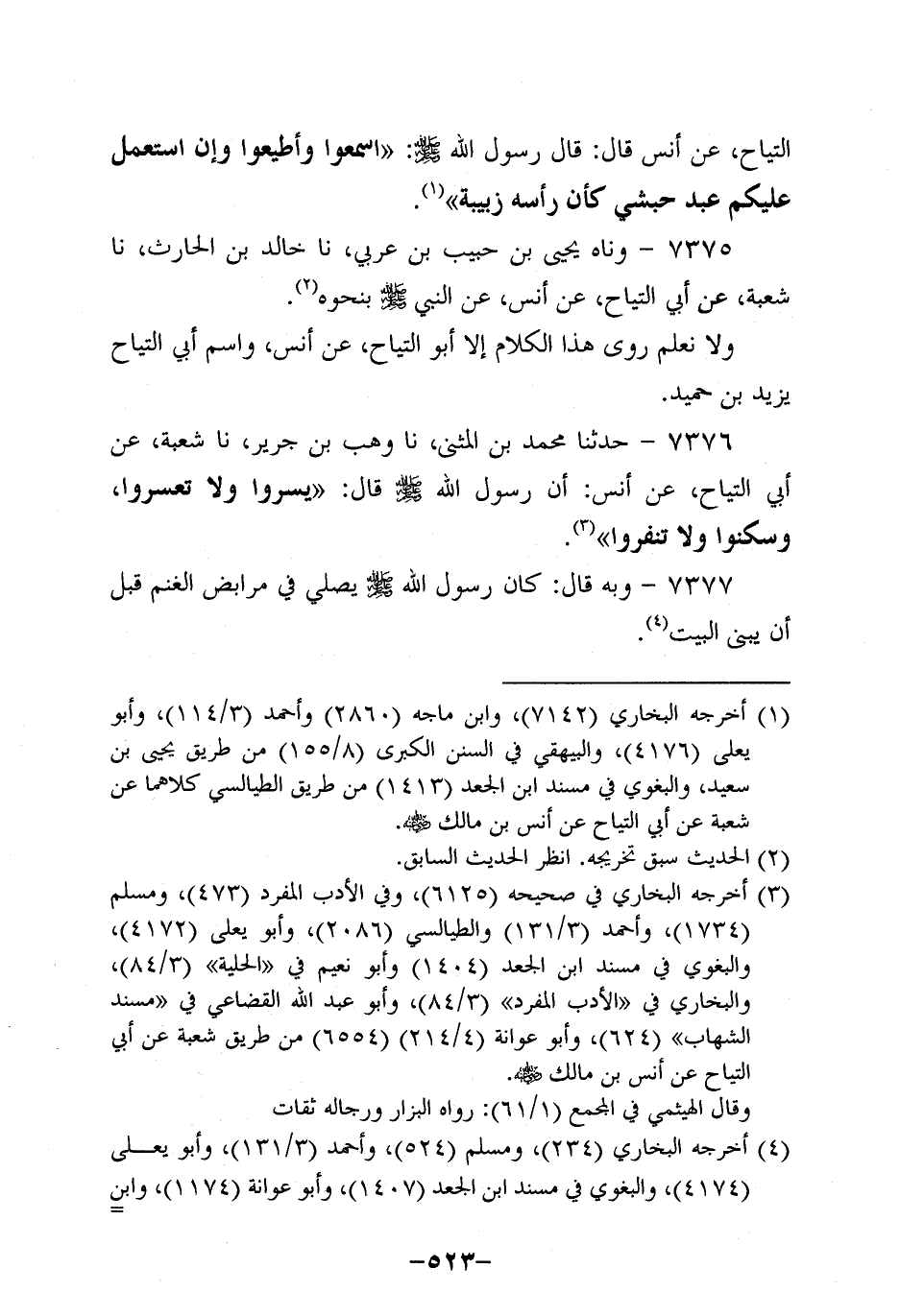 7376- حَدَّثَنَا مُحَمَّدُ بْنُ الْمُثَنَّى، حَدَّثَنَا وَهْبُ بْنُ جَرِيرٍ، حَدَّثَنَا شُعْبَةُ، عَنْ أَبِي التَّيَّاحِ، عَنْ أَنَسٍ، أَنَّ رَسُولَ اللهِ صَلَّى اللَّهُ عَلَيْهِ وَسَلَّمَ قَالَ: يَسِّرُوا وَلا تُعَسِّرُوا، وَسَكِّنُوا وَلا تُنَفِّرُوا.